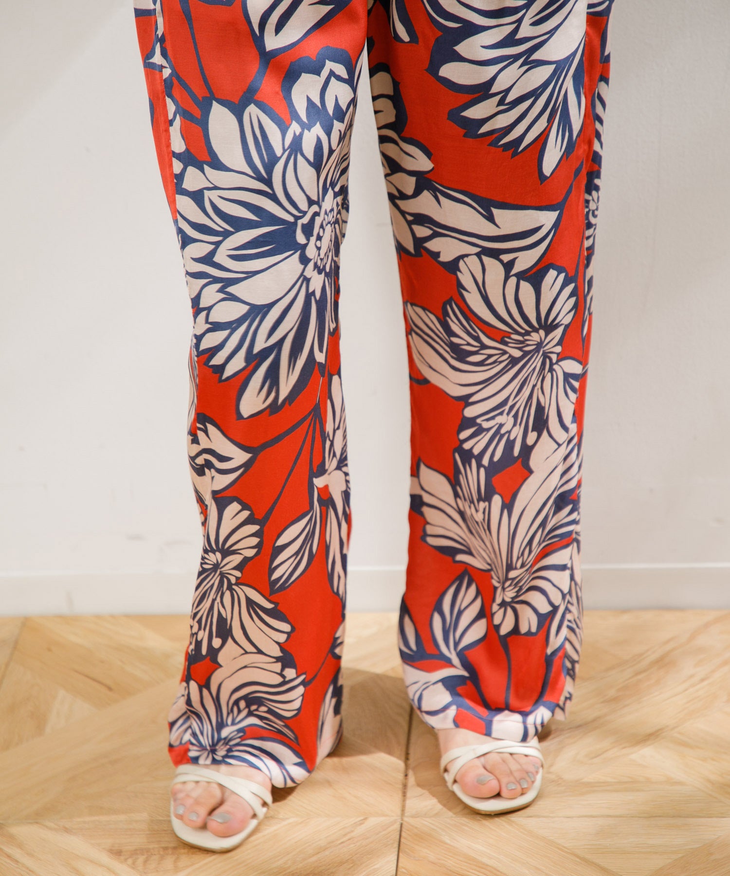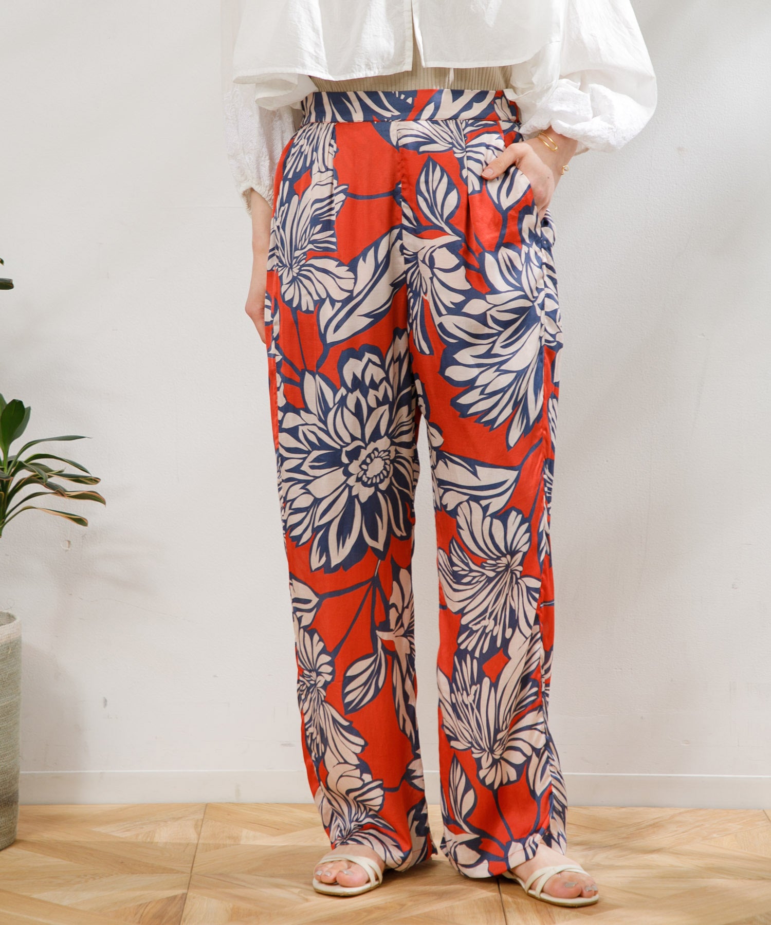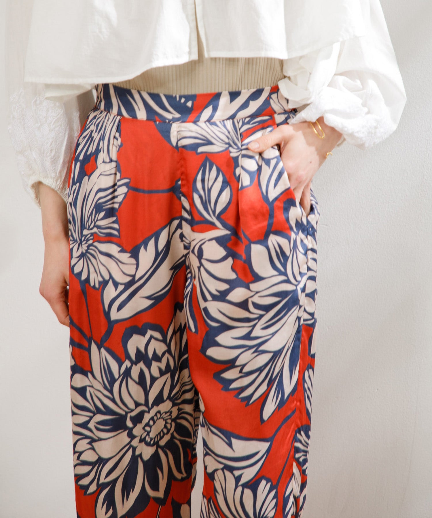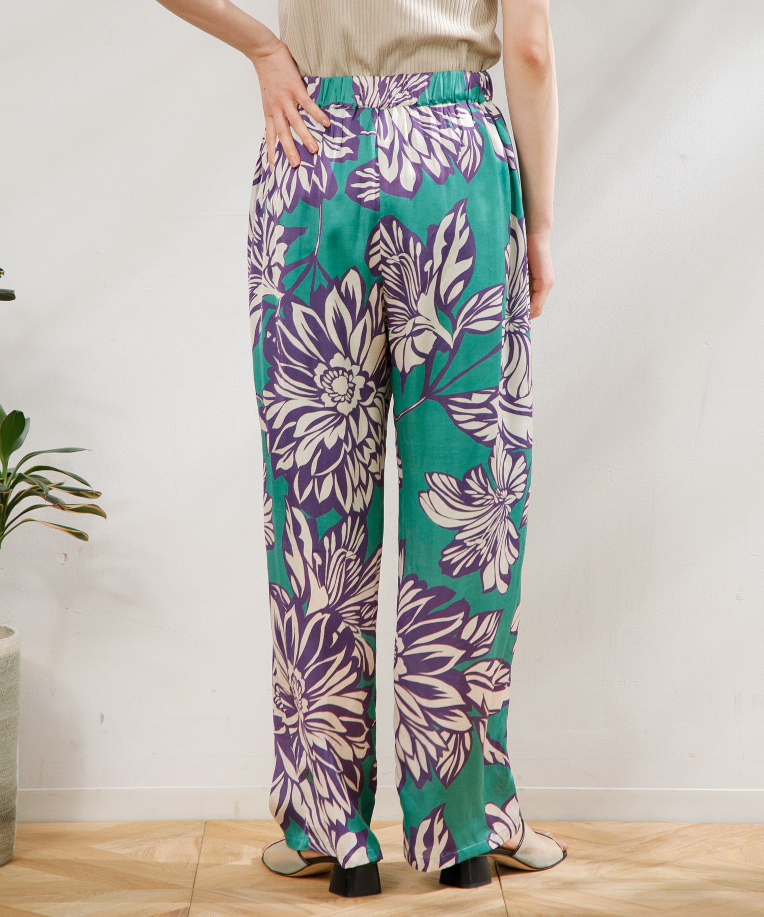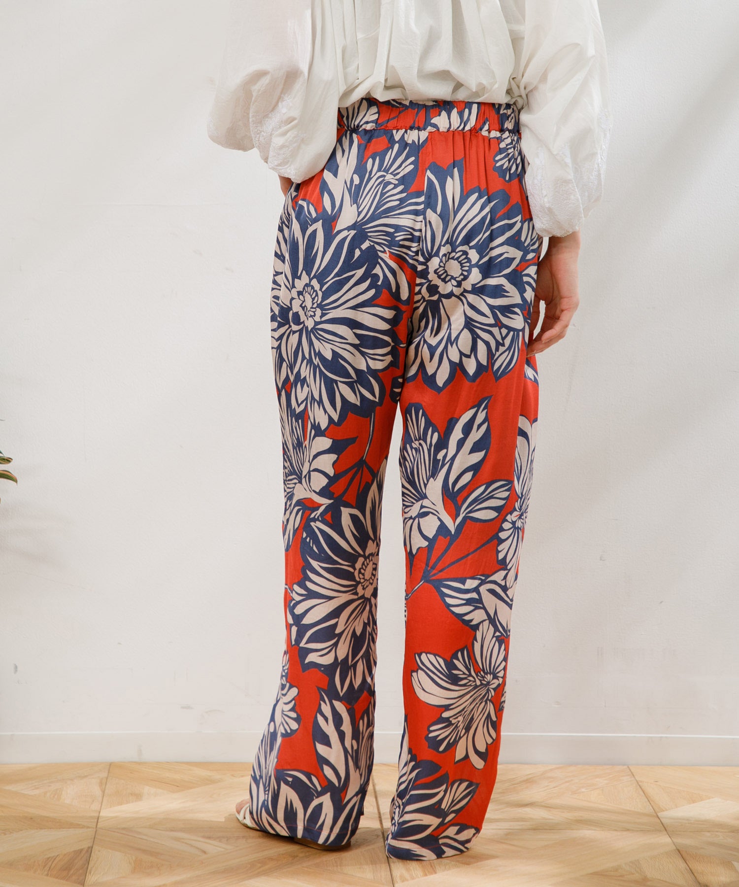 カラフルで印象的な花柄が特徴のサテンパンツ。 膝部分までのコットンの裏地がついているので肌に張り付かず、ウエストフリーになっているのでロングシーズン快適に着ていただけます。 大胆な花柄がスタイリングのアクセントになるので、夏のTシャツなどと合わせて大活躍するアイテムです。