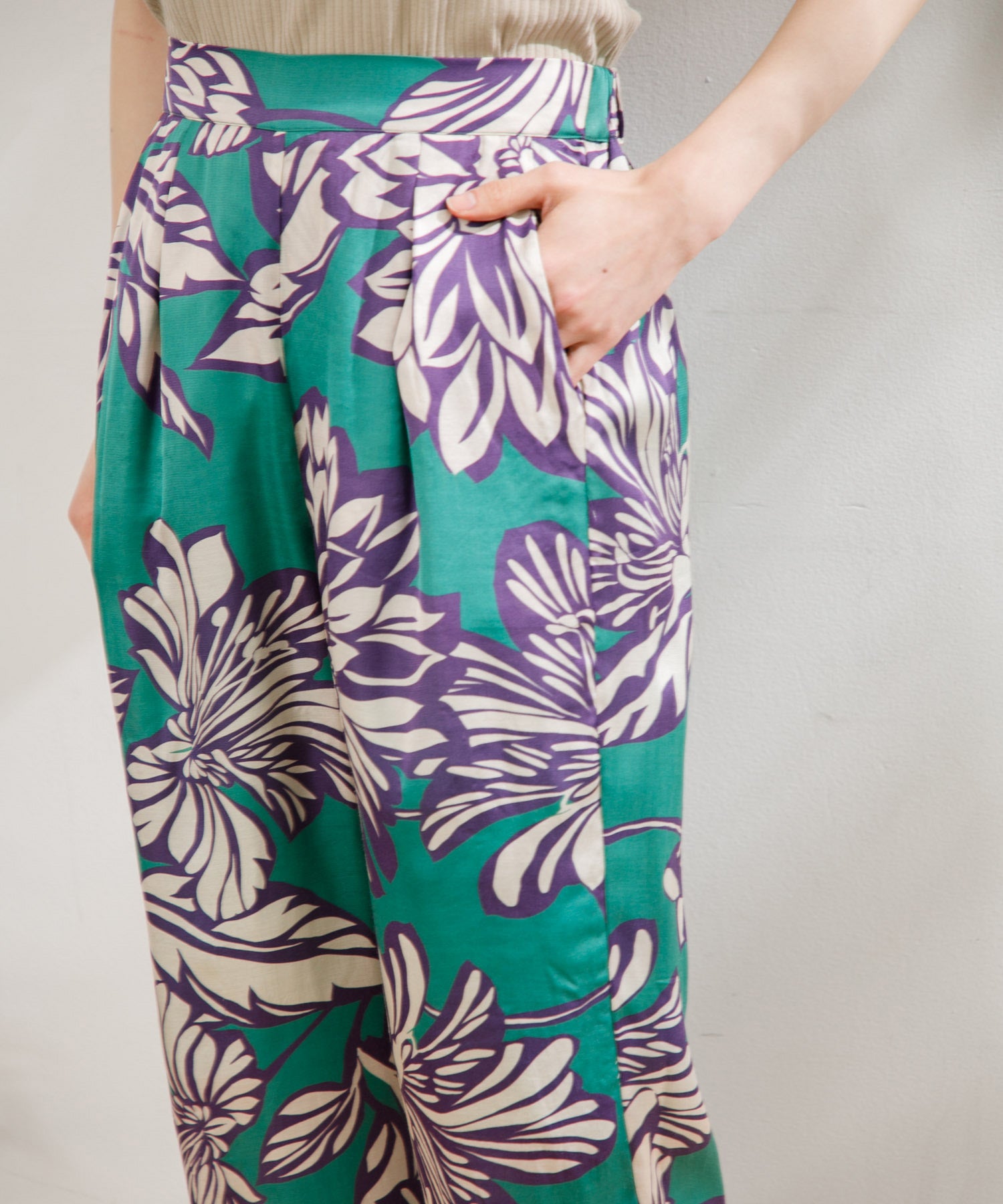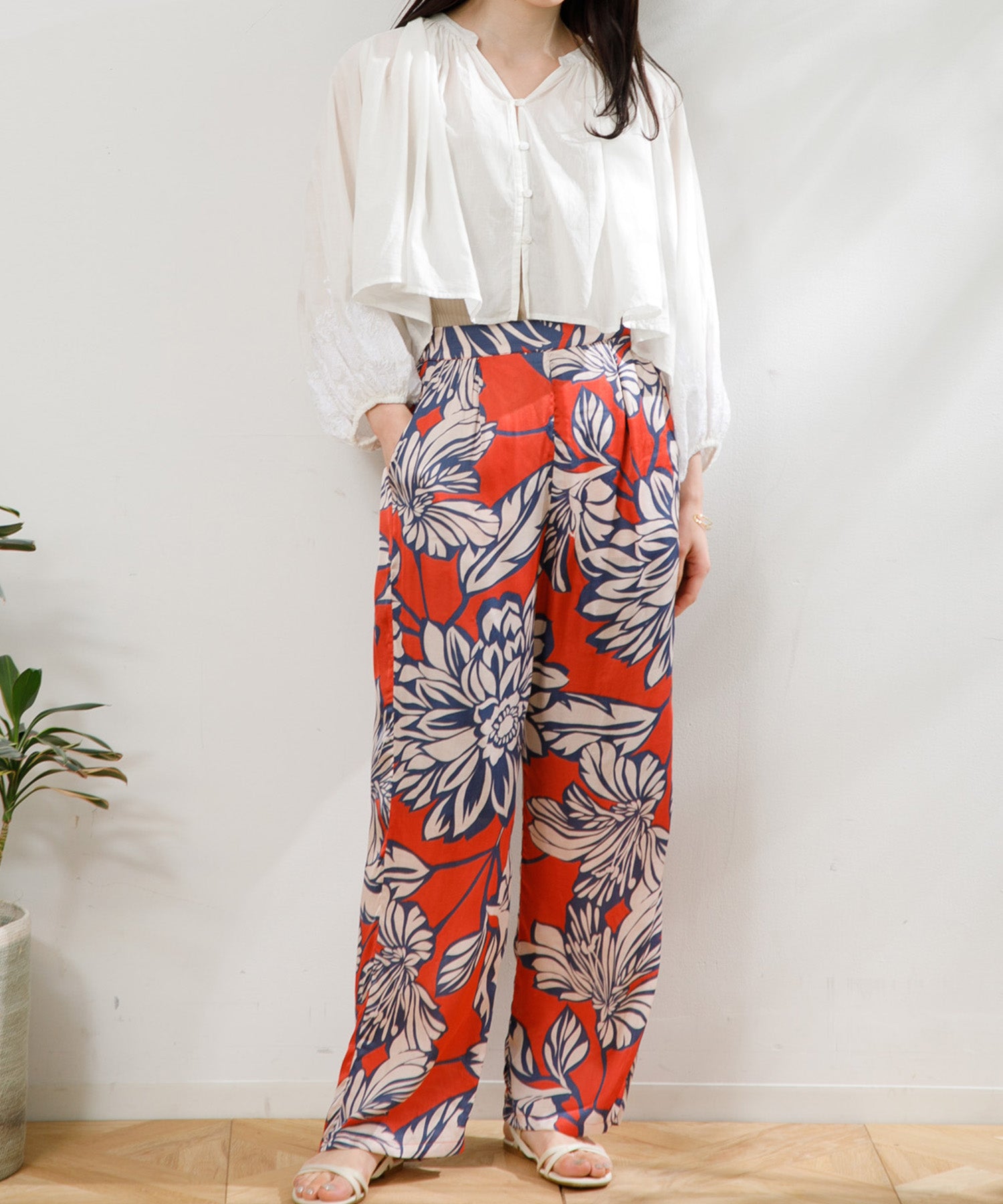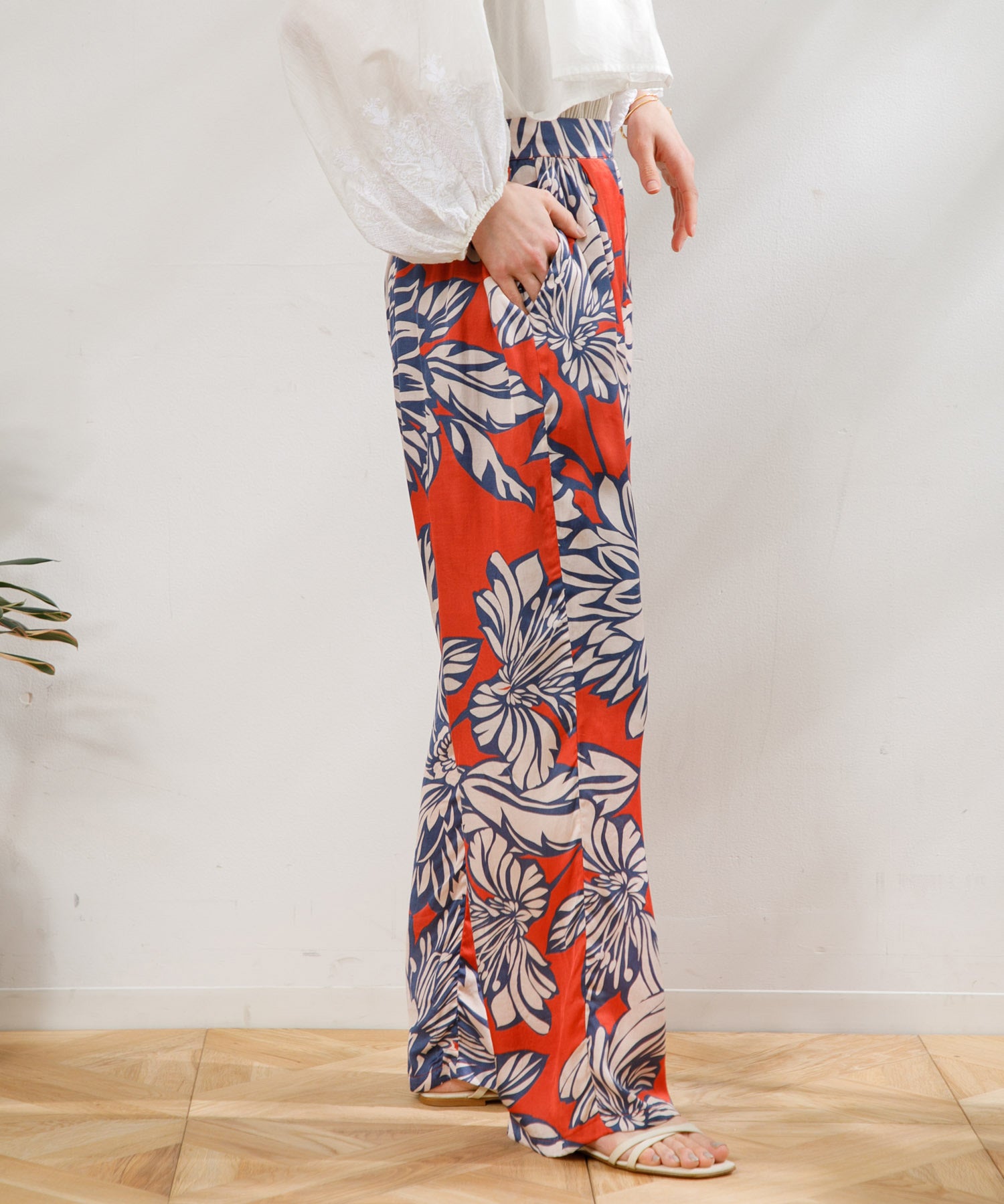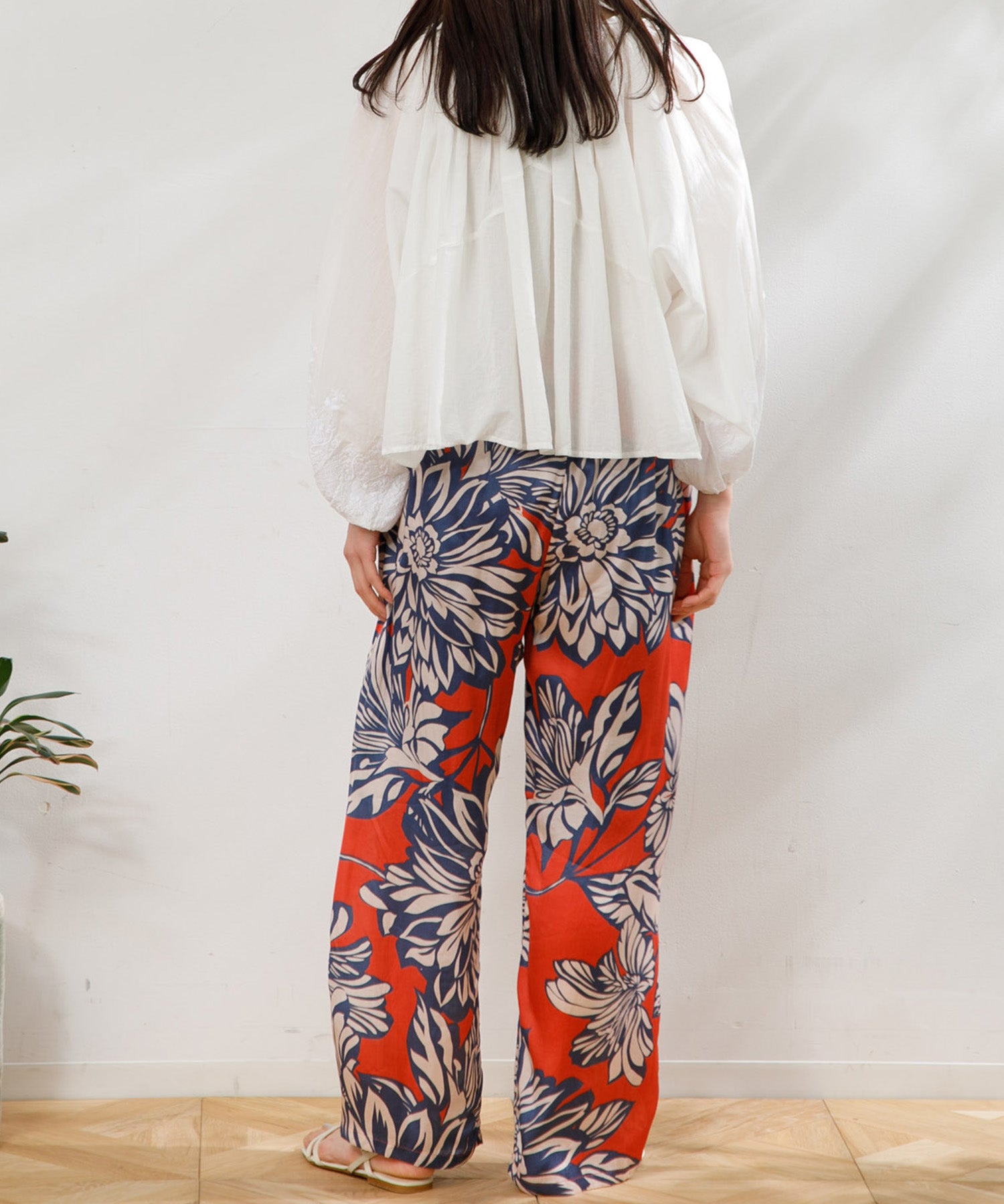 カラフルで印象的な花柄が特徴のサテンパンツ。 膝部分までのコットンの裏地がついているので肌に張り付かず、ウエストフリーになっているのでロングシーズン快適に着ていただけます。 大胆な花柄がスタイリングのアクセントになるので、夏のTシャツなどと合わせて大活躍するアイテムです。