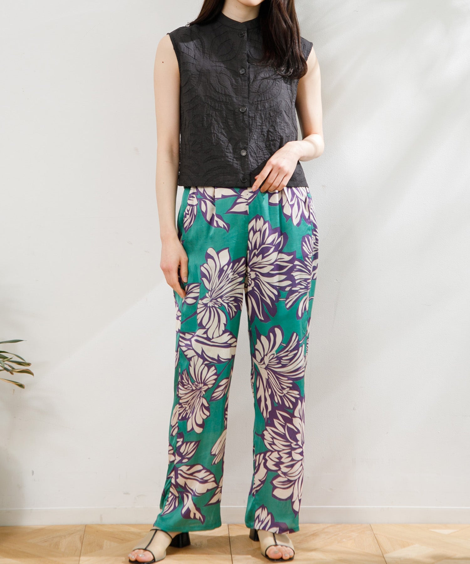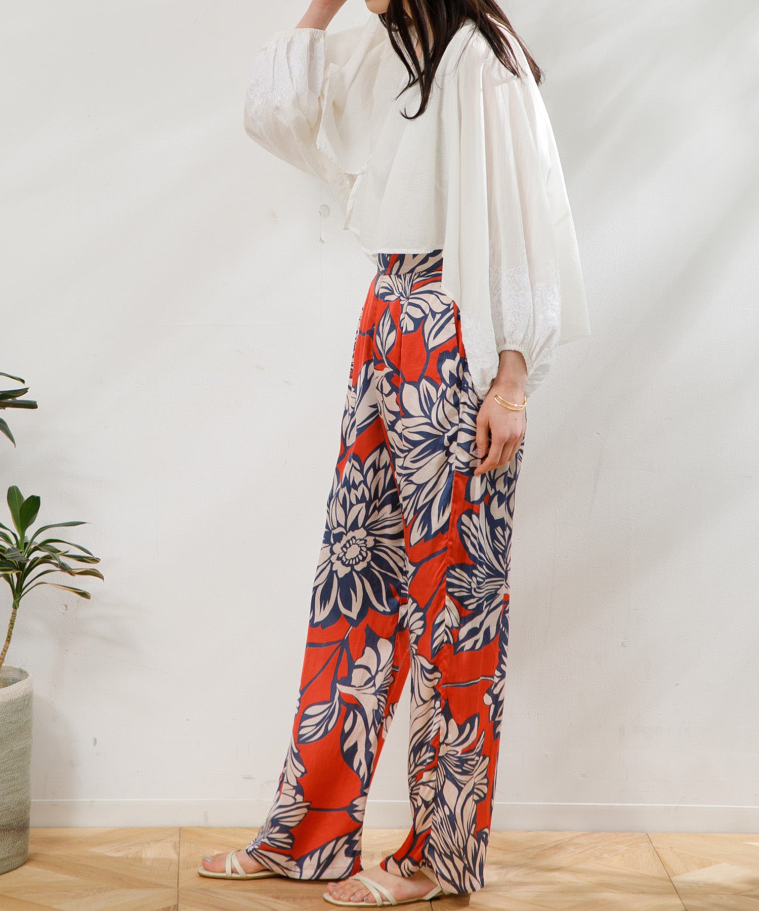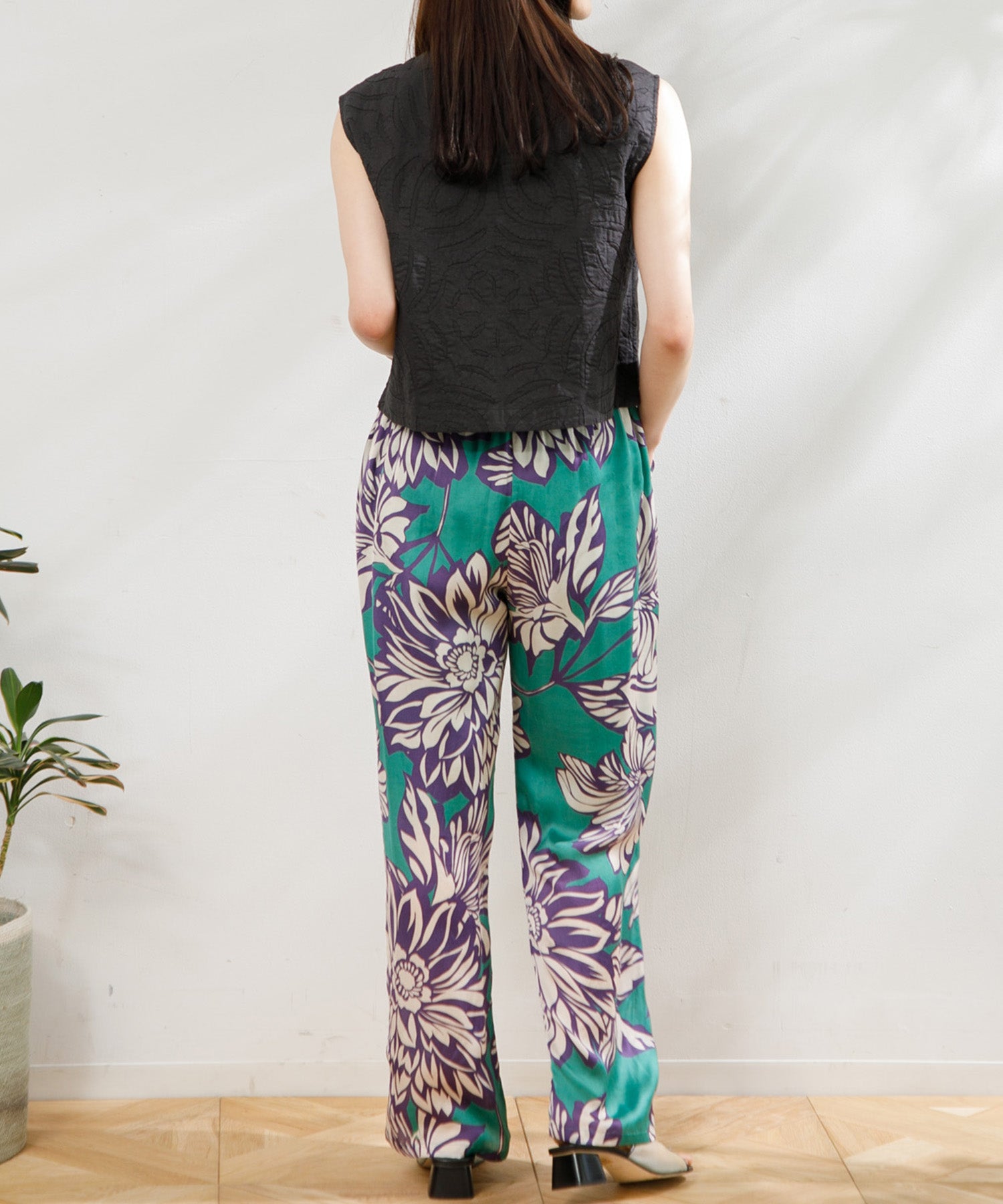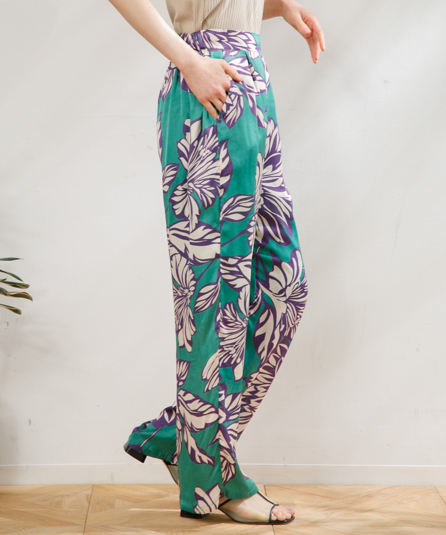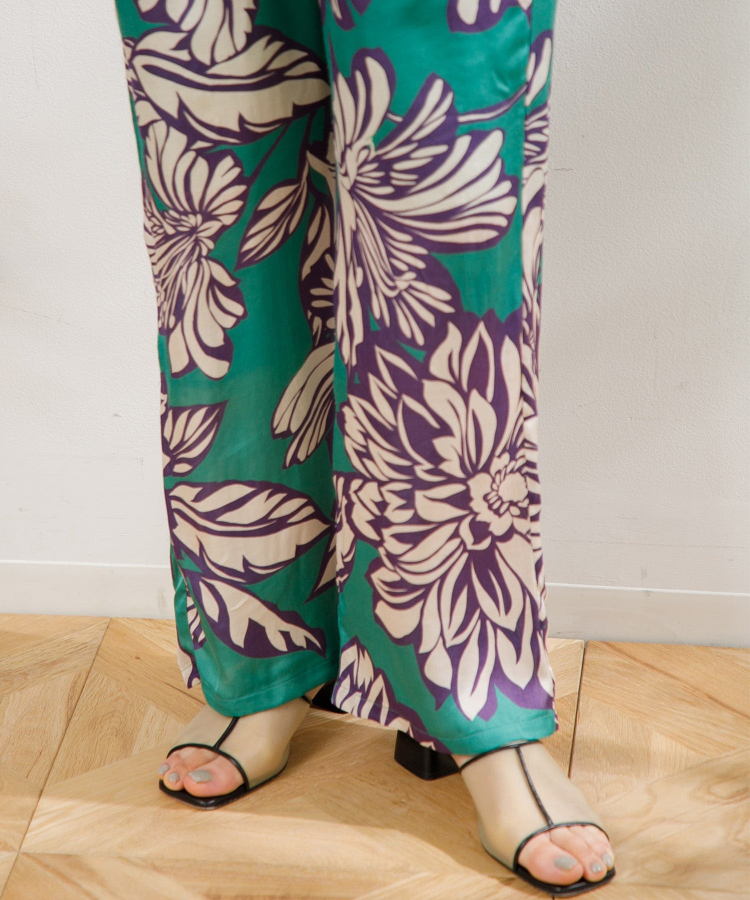 カラフルで印象的な花柄が特徴のサテンパンツ。 膝部分までのコットンの裏地がついているので肌に張り付かず、ウエストフリーになっているのでロングシーズン快適に着ていただけます。 大胆な花柄がスタイリングのアクセントになるので、夏のTシャツなどと合わせて大活躍するアイテムです。