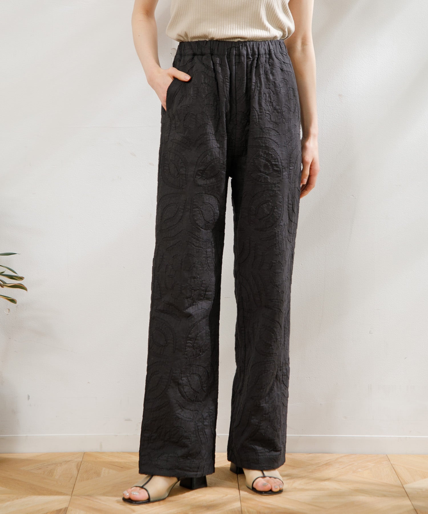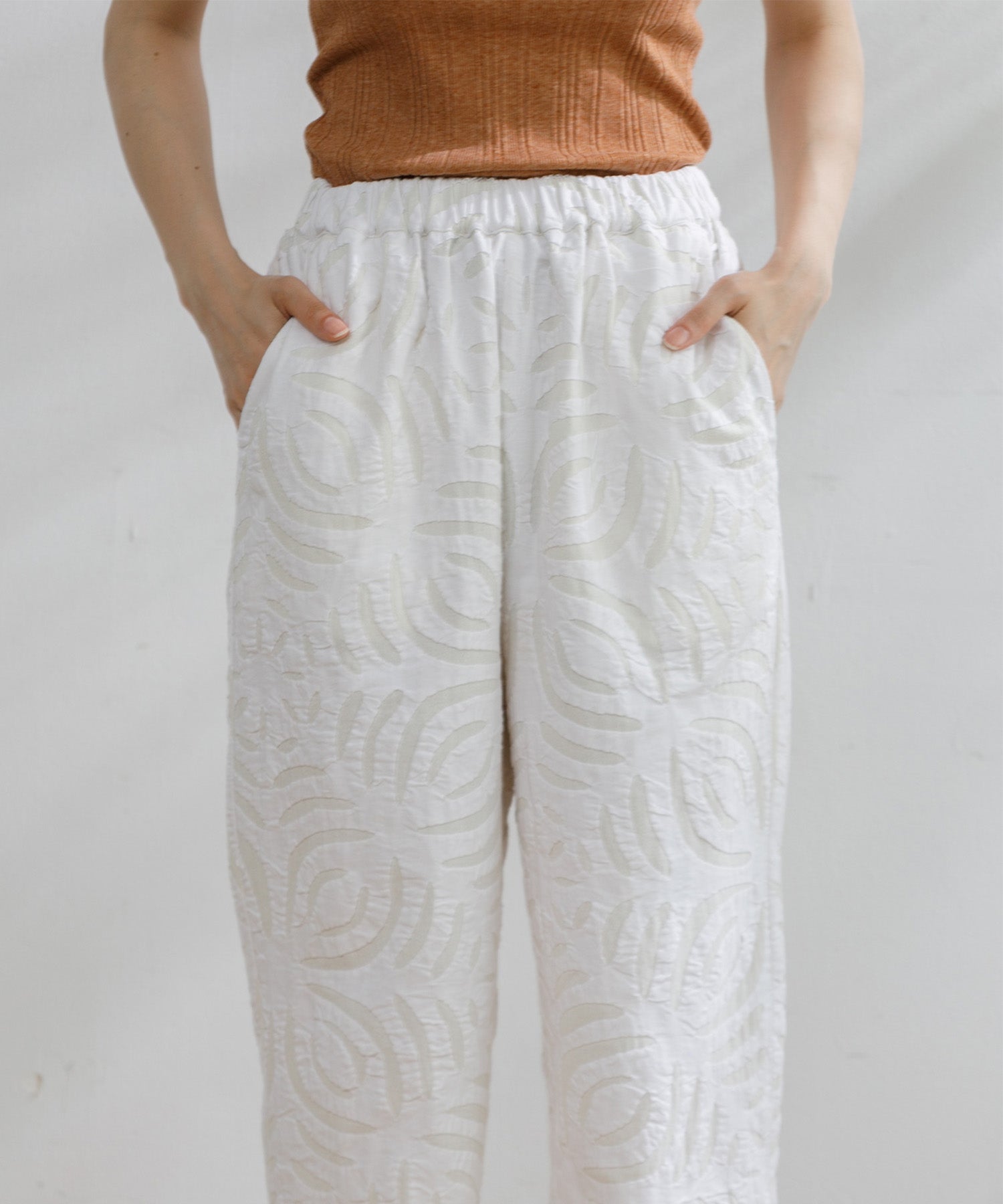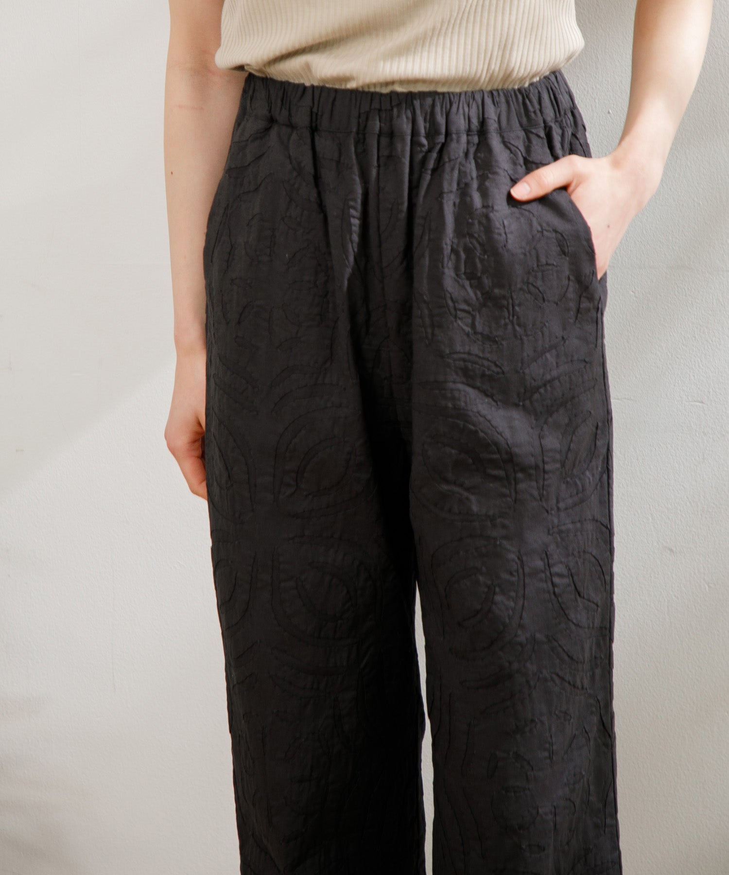 2枚の生地を重ね合わせ、図形を切り抜きながら手作業でステッチを施す【リバースアップリケ】技法を用いたパンツ。ストレートなシルエットが様々なトップスに合わせやすく、ウエストゴムでイージーに履けるので夏に大活躍するアイテムです。両サイドのポケットも便利。同じリバースアップリケのベストとセットアップコーデもおすすめです。