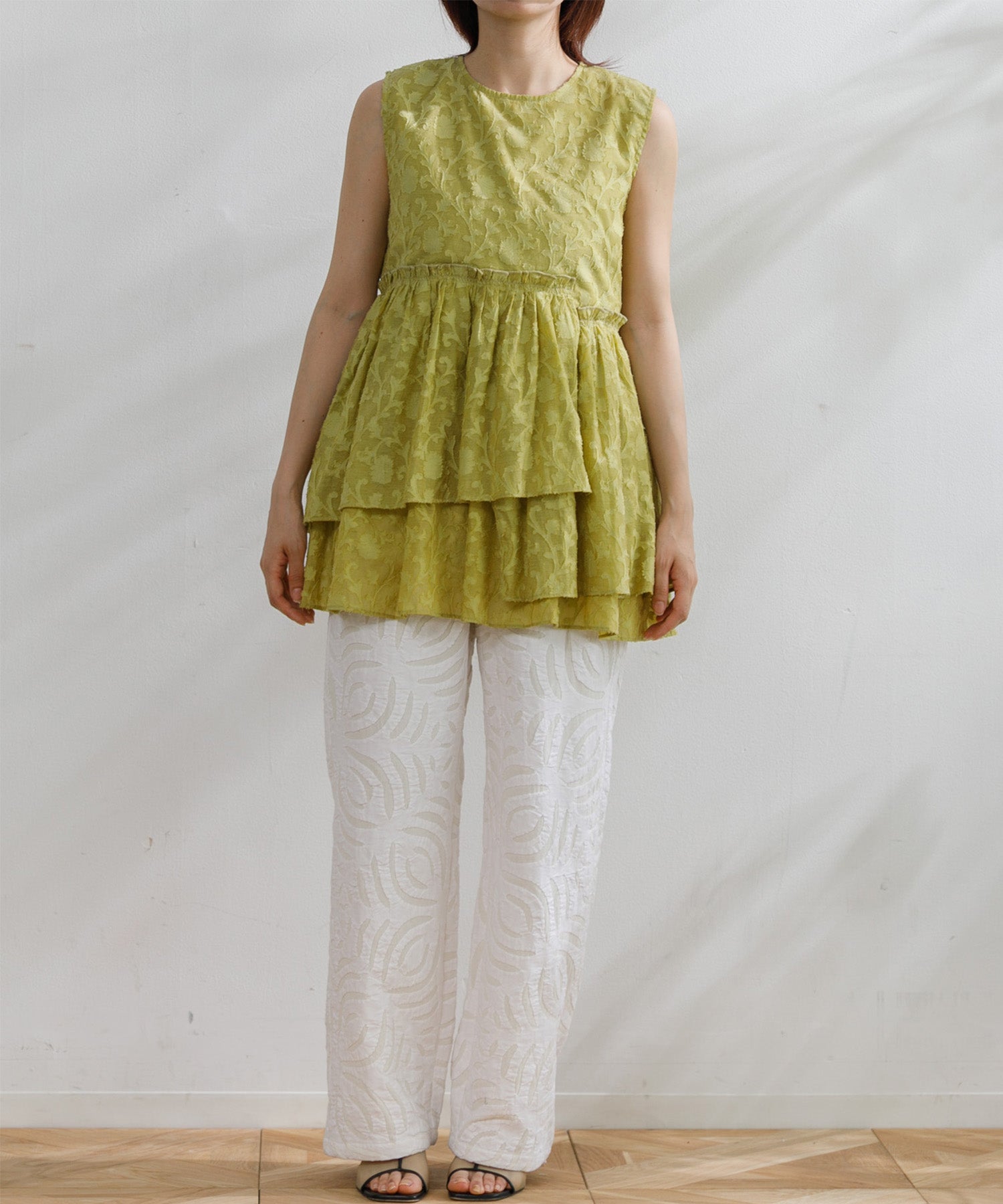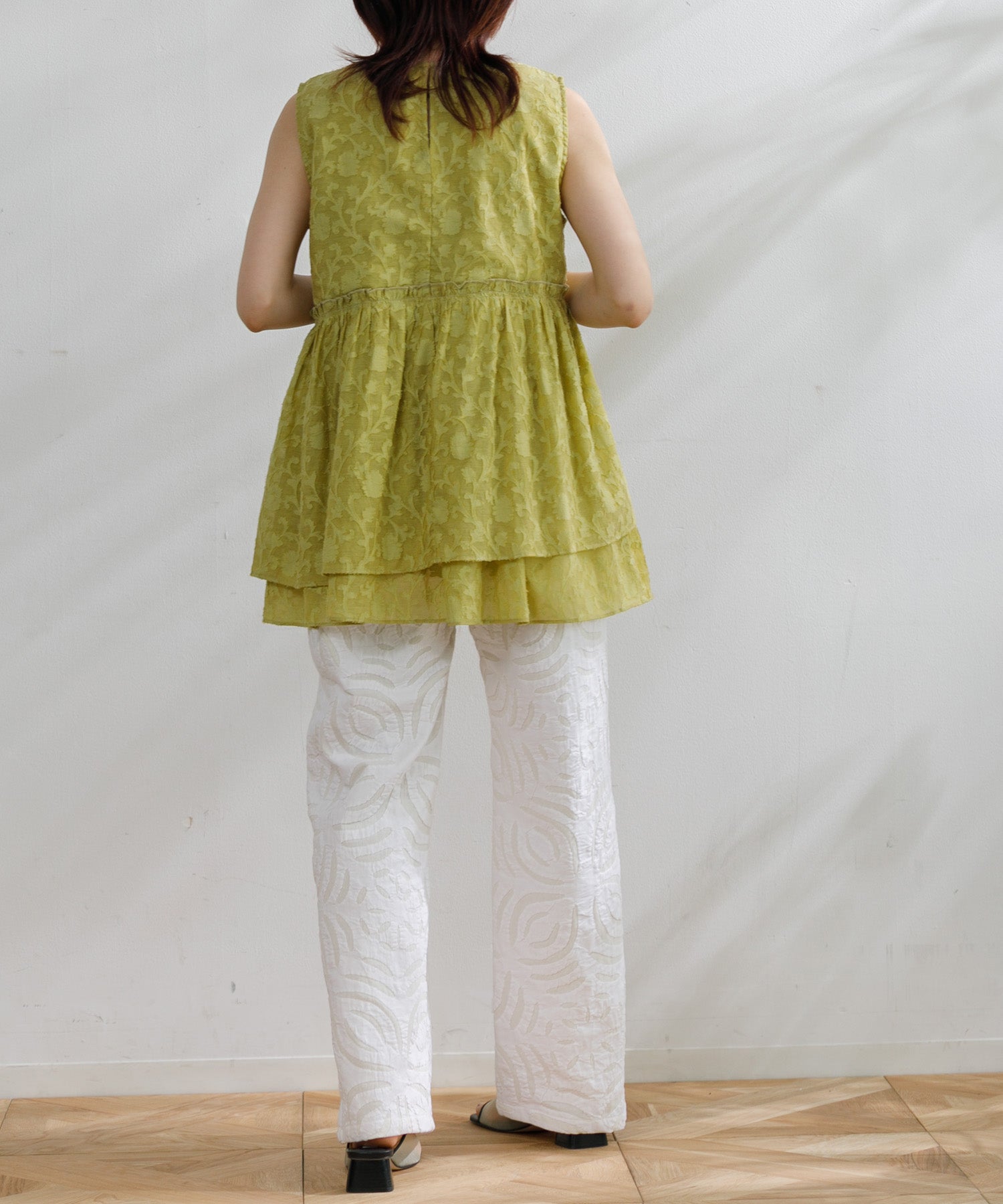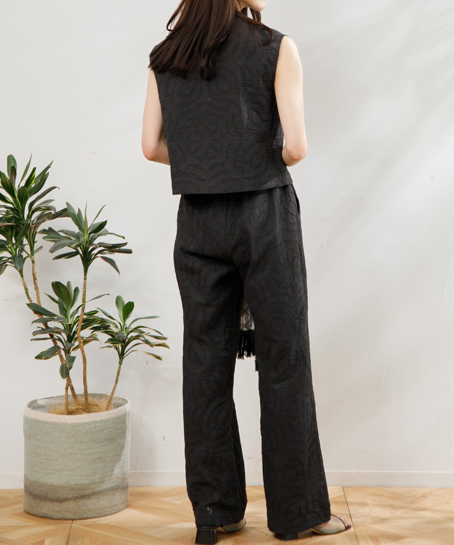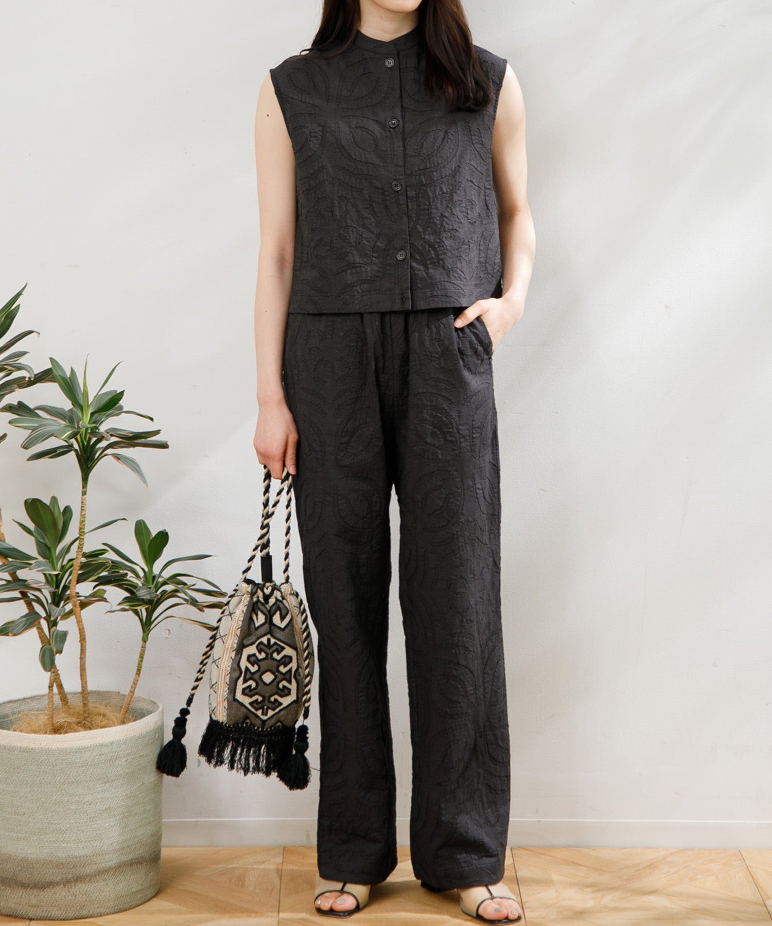 2枚の生地を重ね合わせ、図形を切り抜きながら手作業でステッチを施す【リバースアップリケ】技法を用いたパンツ。ストレートなシルエットが様々なトップスに合わせやすく、ウエストゴムでイージーに履けるので夏に大活躍するアイテムです。両サイドのポケットも便利。同じリバースアップリケのベストとセットアップコーデもおすすめです。