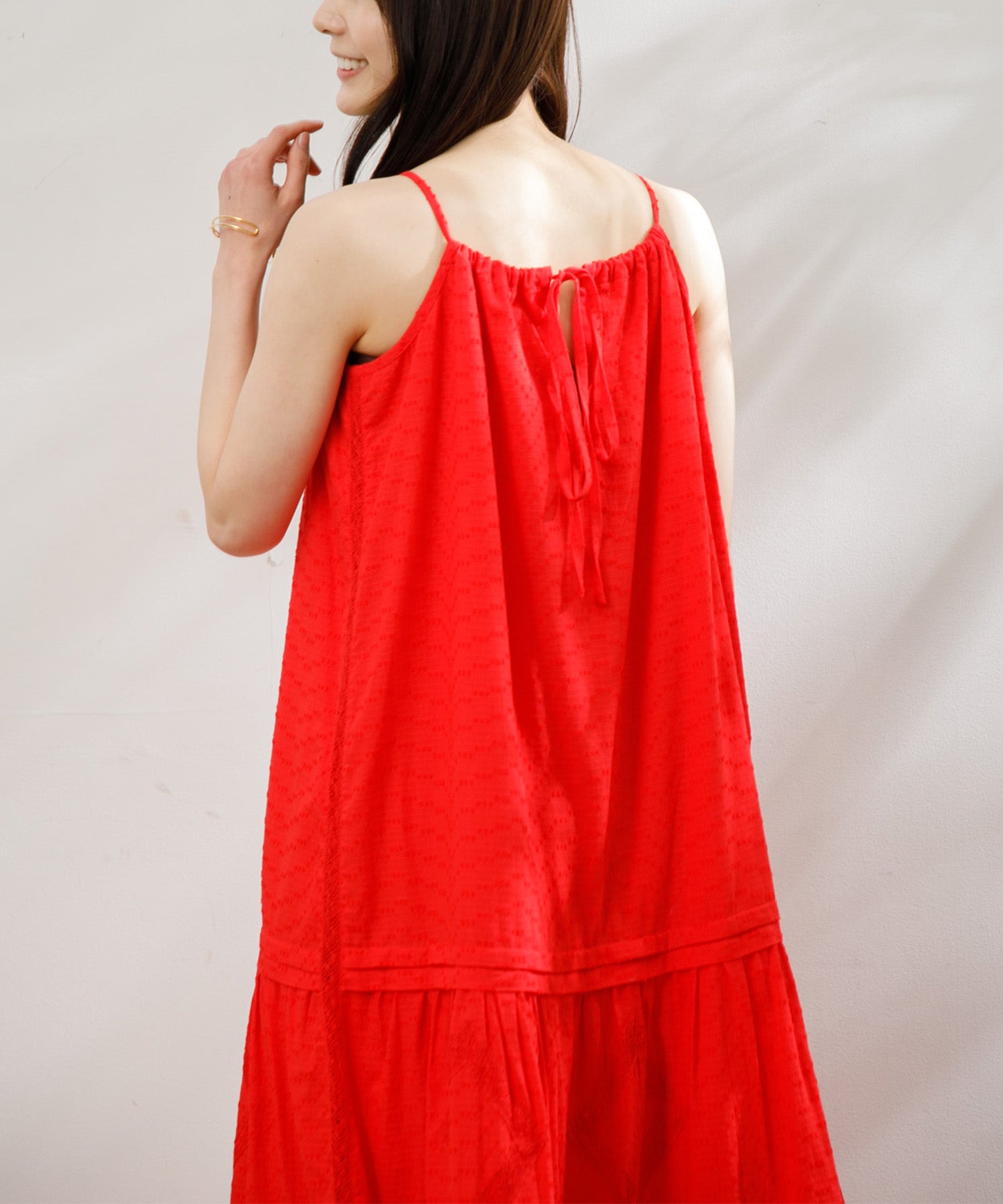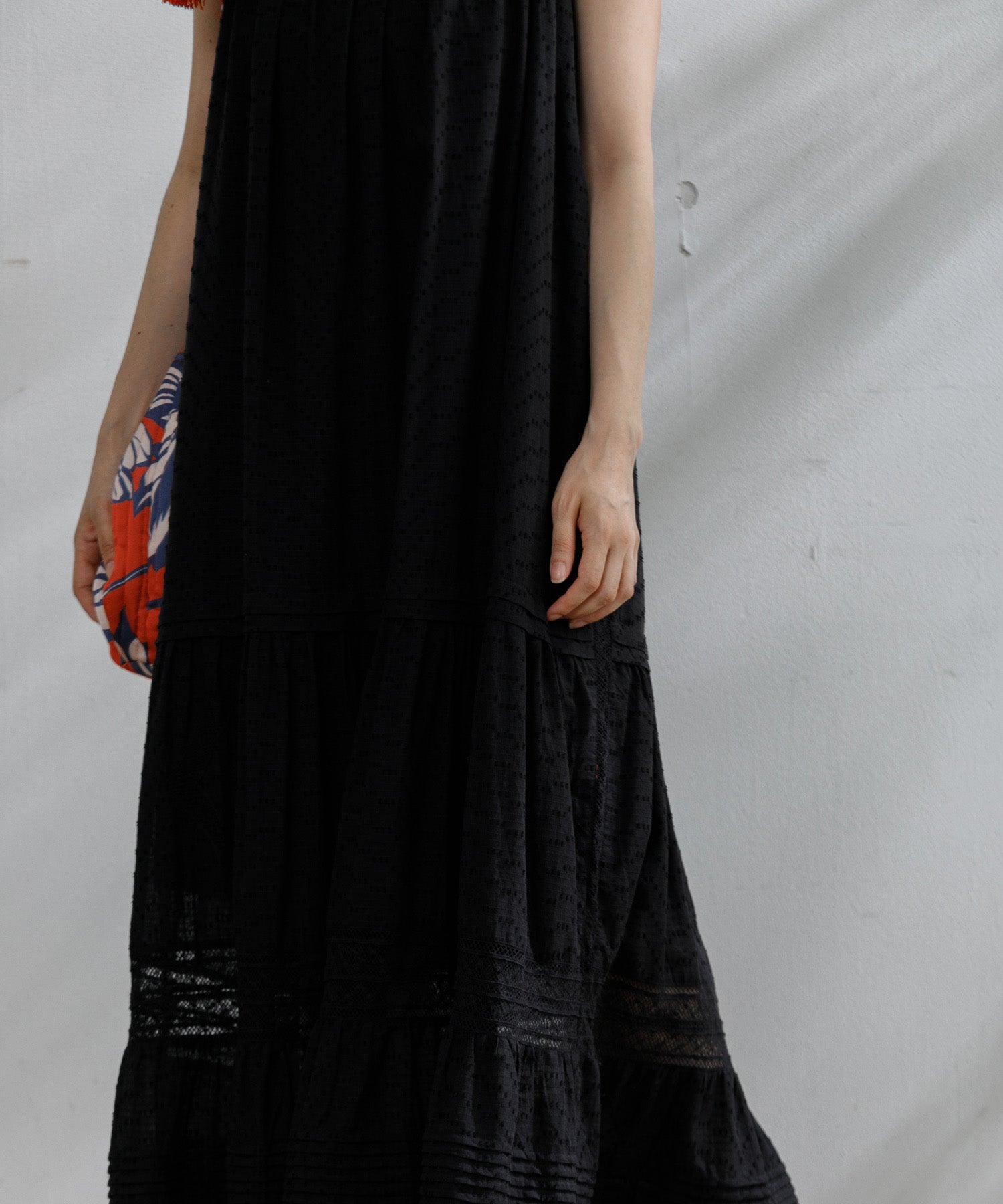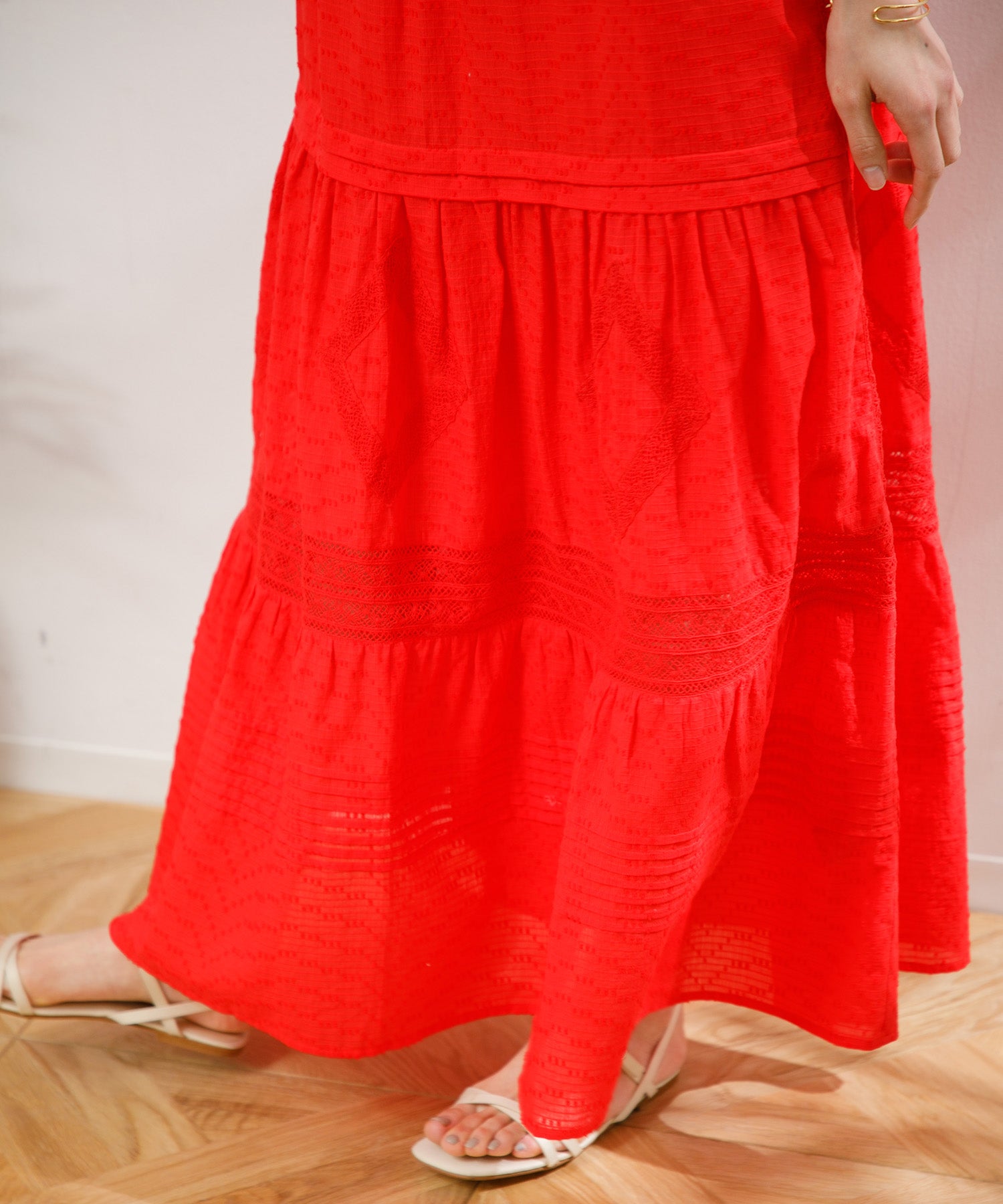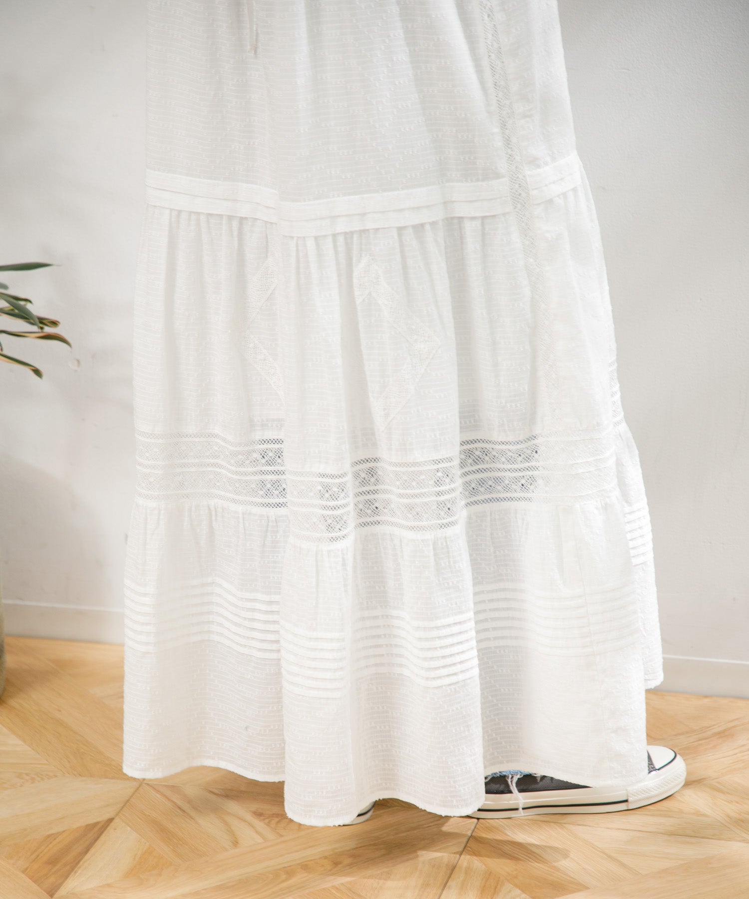 職人の技術が光る、1枚1枚丁寧に時間をかけてレースを縫い付けて作られた美しい生地を使用したワンピース。薄手のコットンドビー素材がナチュラルな質感をもたらし、デイリーに着こなしやすく、Tシャツと合わせたカジュアルなスタイルから、アップした着こなしまで様々なスタイリングが楽しめる1着です。裾の切り替えにより、たっぷりとしたギャザーが風をはらみ、ふわっと軽やかな雰囲気に。裏地が付いていて透けにくい仕上がりになっています。
