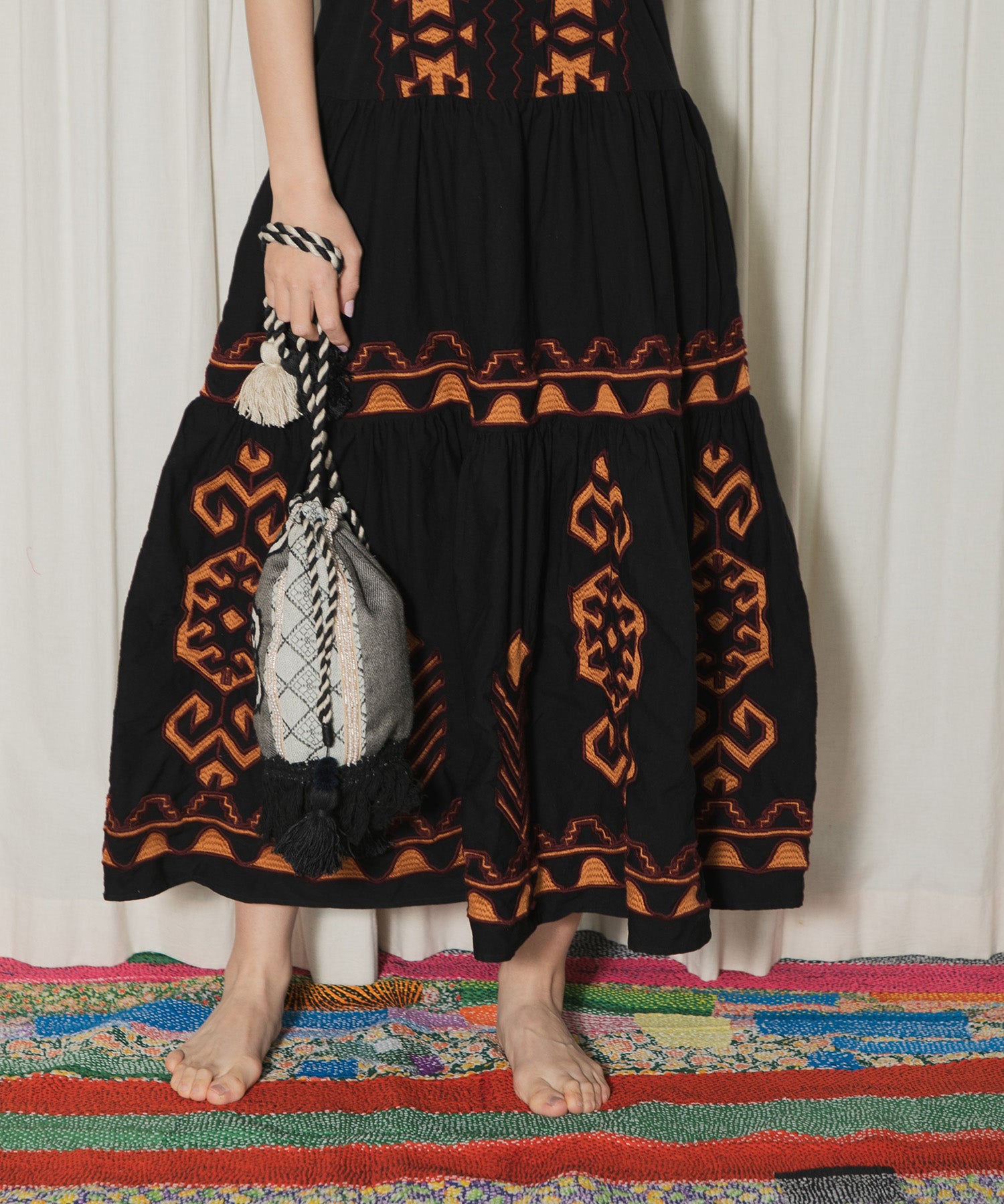 ころんとしたまるいシルエットが印象的な巾着型のバッグ。紐には、簡単に長さ調整できるスライダーが付いており、肩がけ・斜めがけ・手持ちなど、いろんな使い方が楽しめます。スマートフォンと財布、小物を入れるのにちょうどいいサイズ感で、日常使いに最適です。ワンピース/スカートとおそろいの刺繍がデザインポイント。紐先の2カラーのタッセルと裾のフリンジが目を惹き、シンプルなコーデのアクセントにも使えるアイテムとなっています。