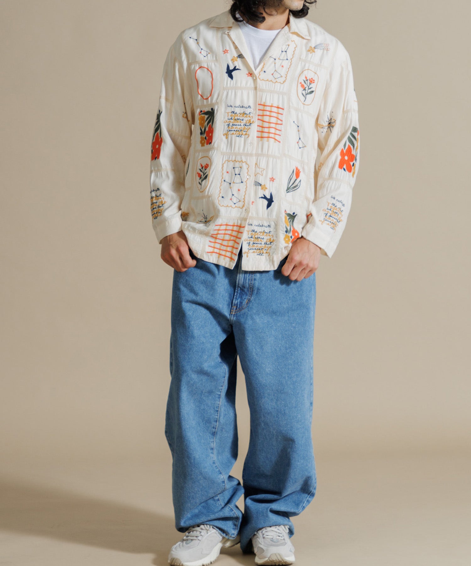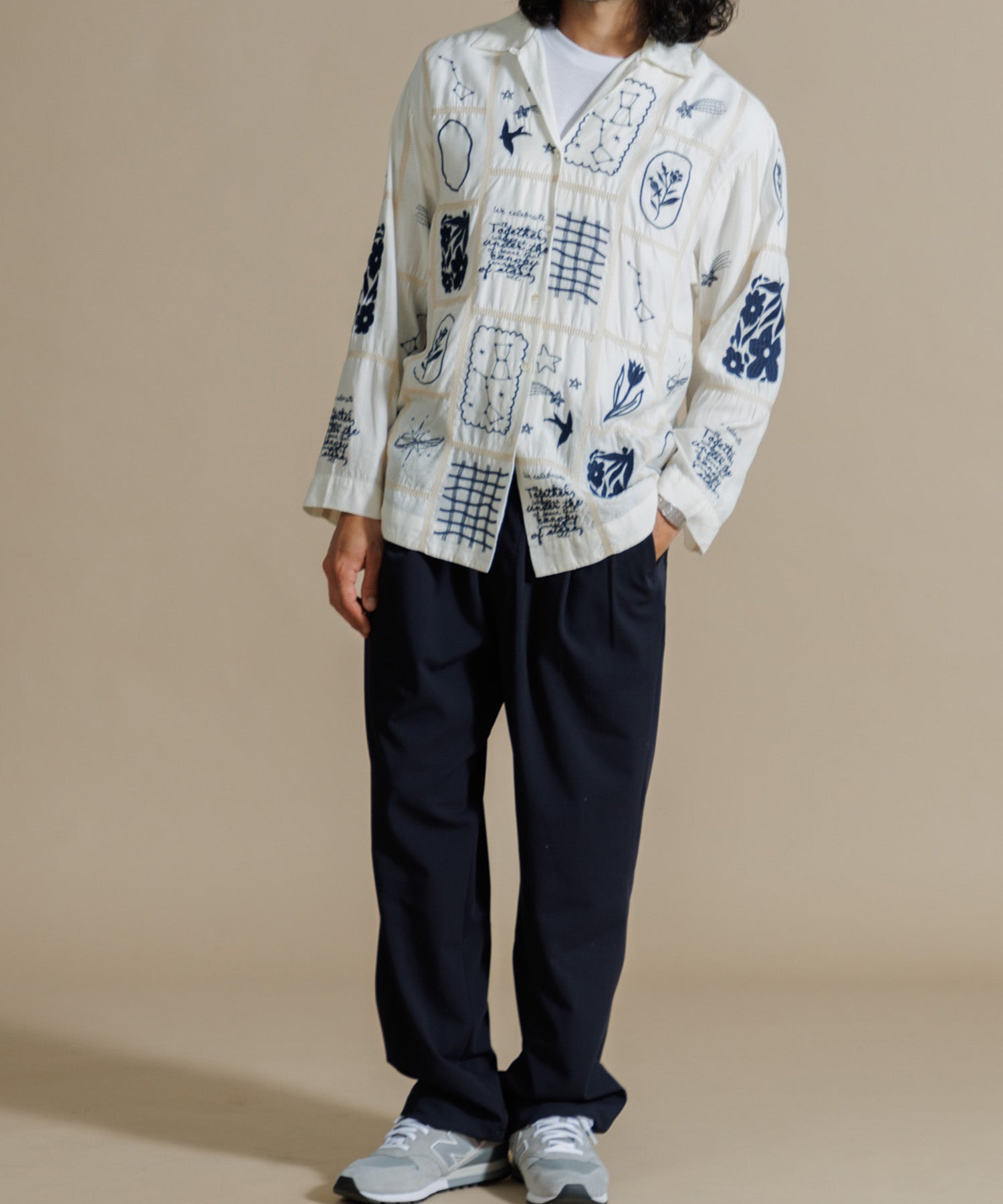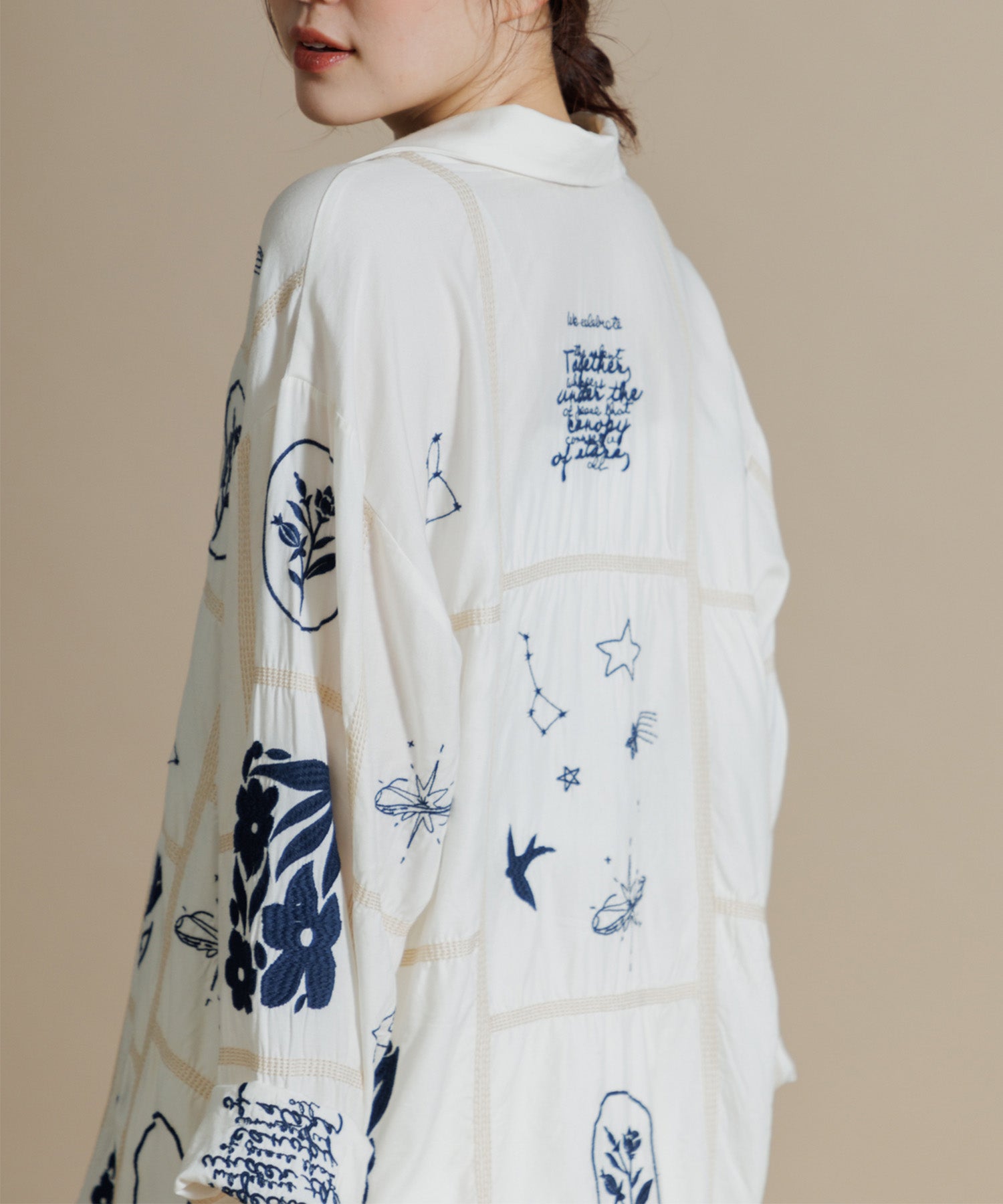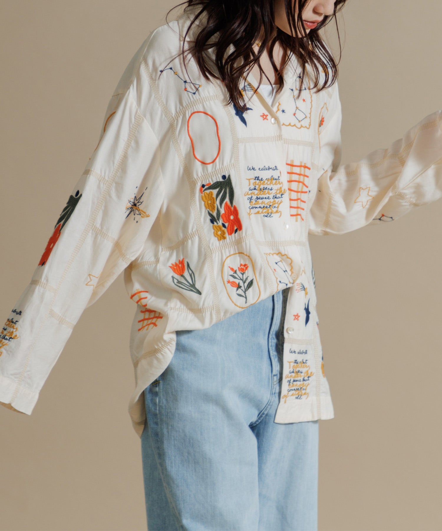 とろみのあるテンセル100%のシャツに、パッチワーク風14柄の刺繍をふんだんにあしらったシャツ。ほどよい肉感に落ち感のある素材で、マシーン刺繍の手法を何種類も入れ雰囲気のある見え方に。1枚で映え、シンプルなボトムスに合わせるだけでこなれた印象に仕上げてくれる一枚です。ユニセックスで着用いただけます。