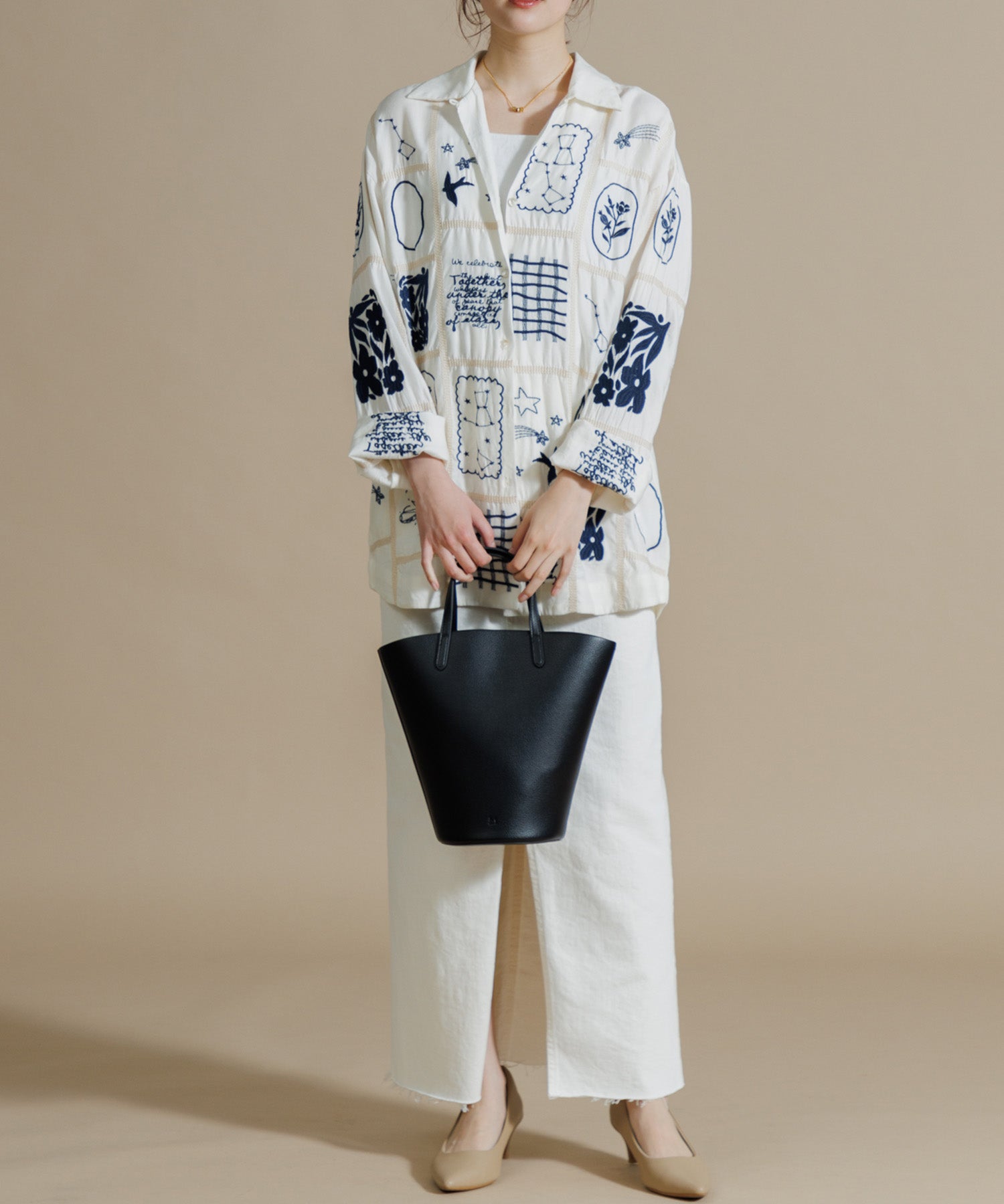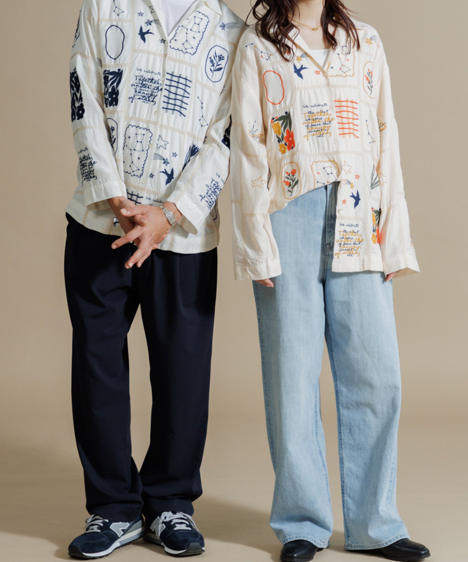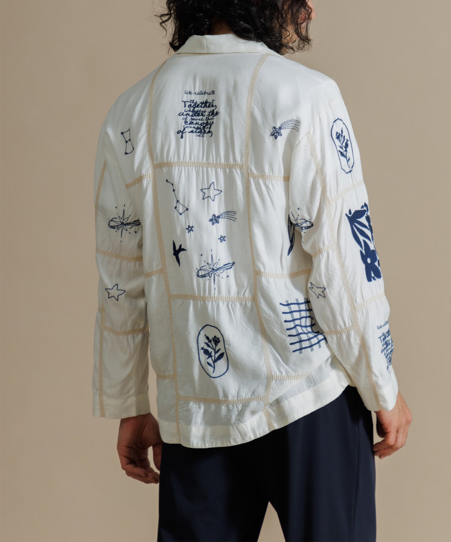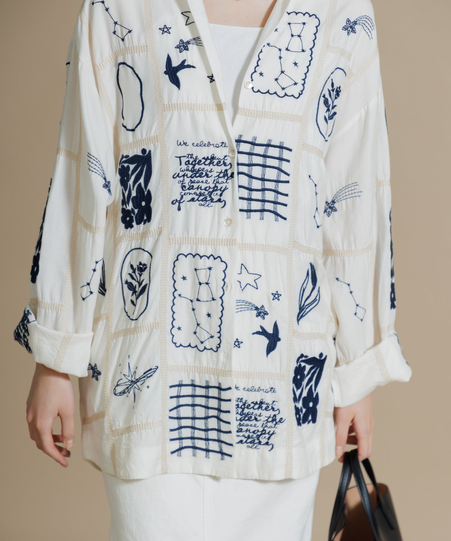 とろみのあるテンセル100%のシャツに、パッチワーク風14柄の刺繍をふんだんにあしらったシャツ。ほどよい肉感に落ち感のある素材で、マシーン刺繍の手法を何種類も入れ雰囲気のある見え方に。1枚で映え、シンプルなボトムスに合わせるだけでこなれた印象に仕上げてくれる一枚です。ユニセックスで着用いただけます。