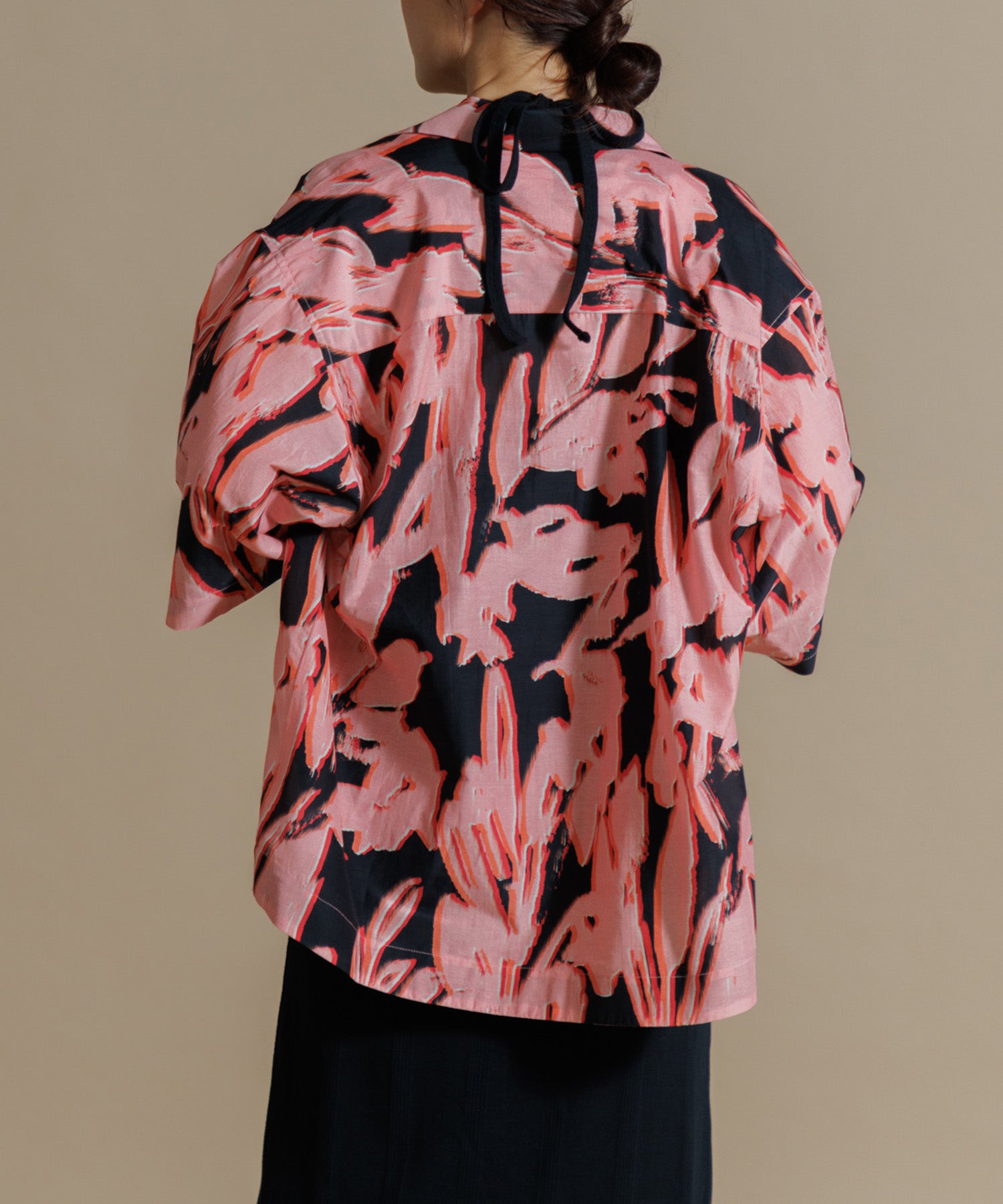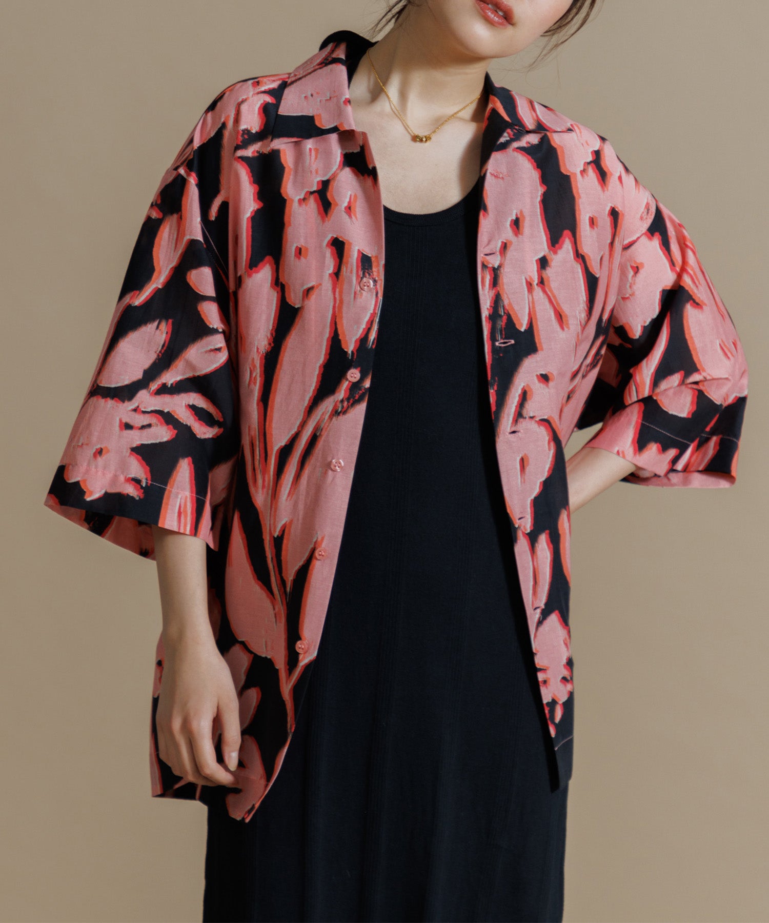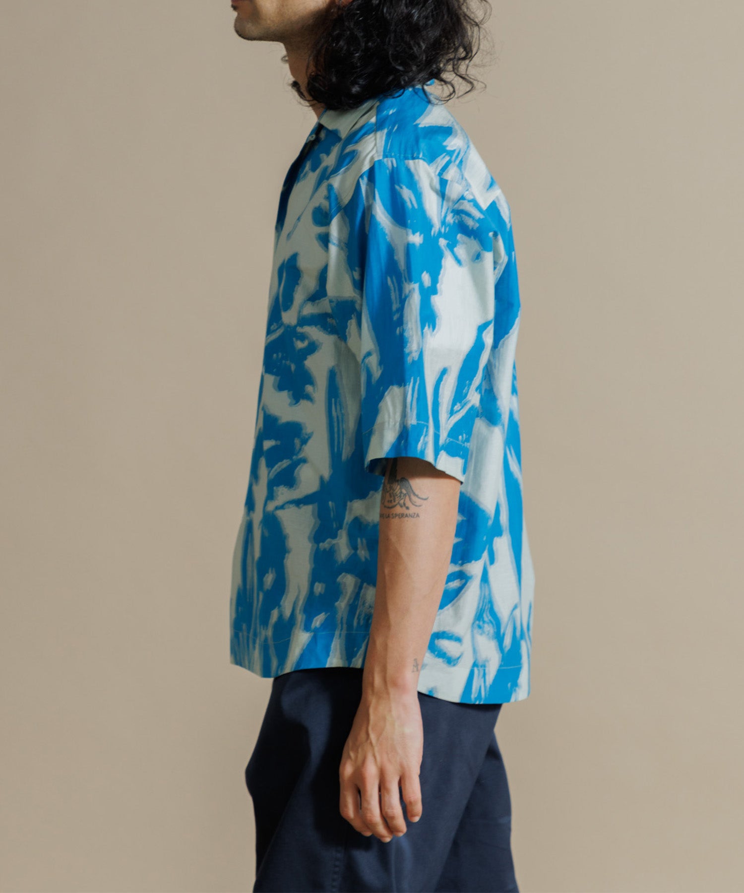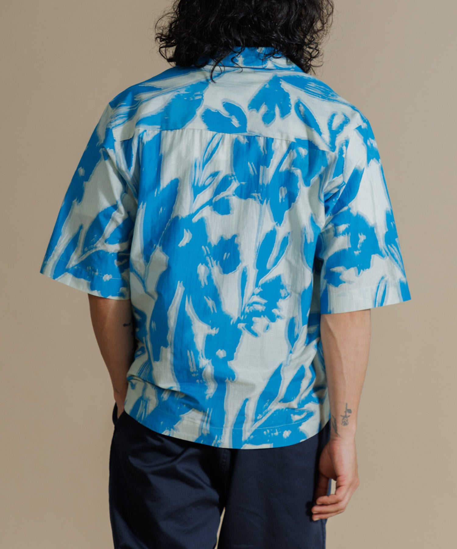 インドシルクの素朴な光沢感と鮮やかなカラーが特徴のオープンカラーシャツ。シルクの強さとコットンの優しさを合わせ持った伝統のハイブリッド素材を使用しています。綿との混紡で柔らかさもあり上品なツヤ感のある素材に、カラフルなリーフ柄プリントを入れ仕上げました。ドロップショルダーになっており、身幅や袖もゆったりと作られたオーバーシルエットがリラクシーなムードの一枚です。ユニセックスで着用いただけます。