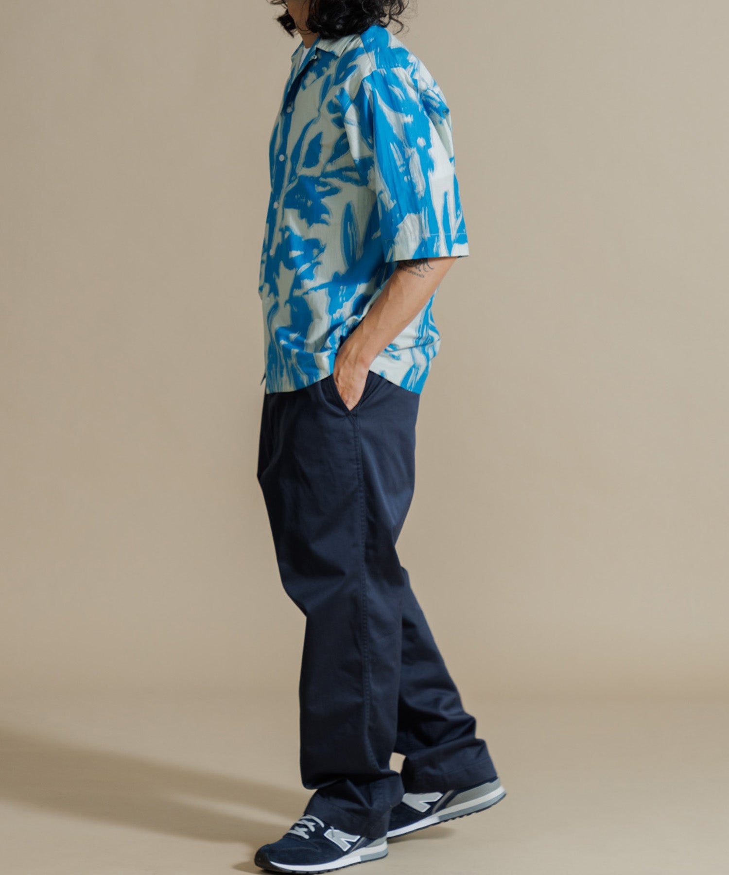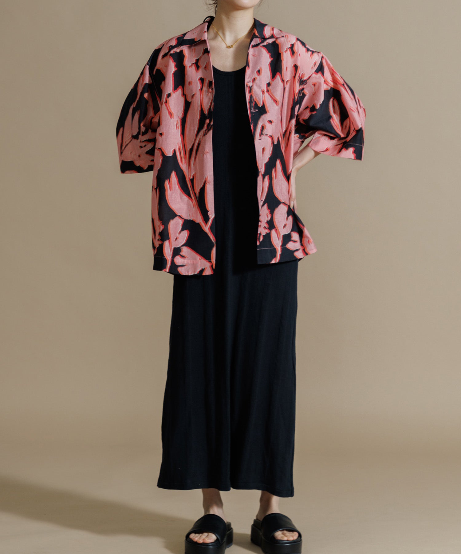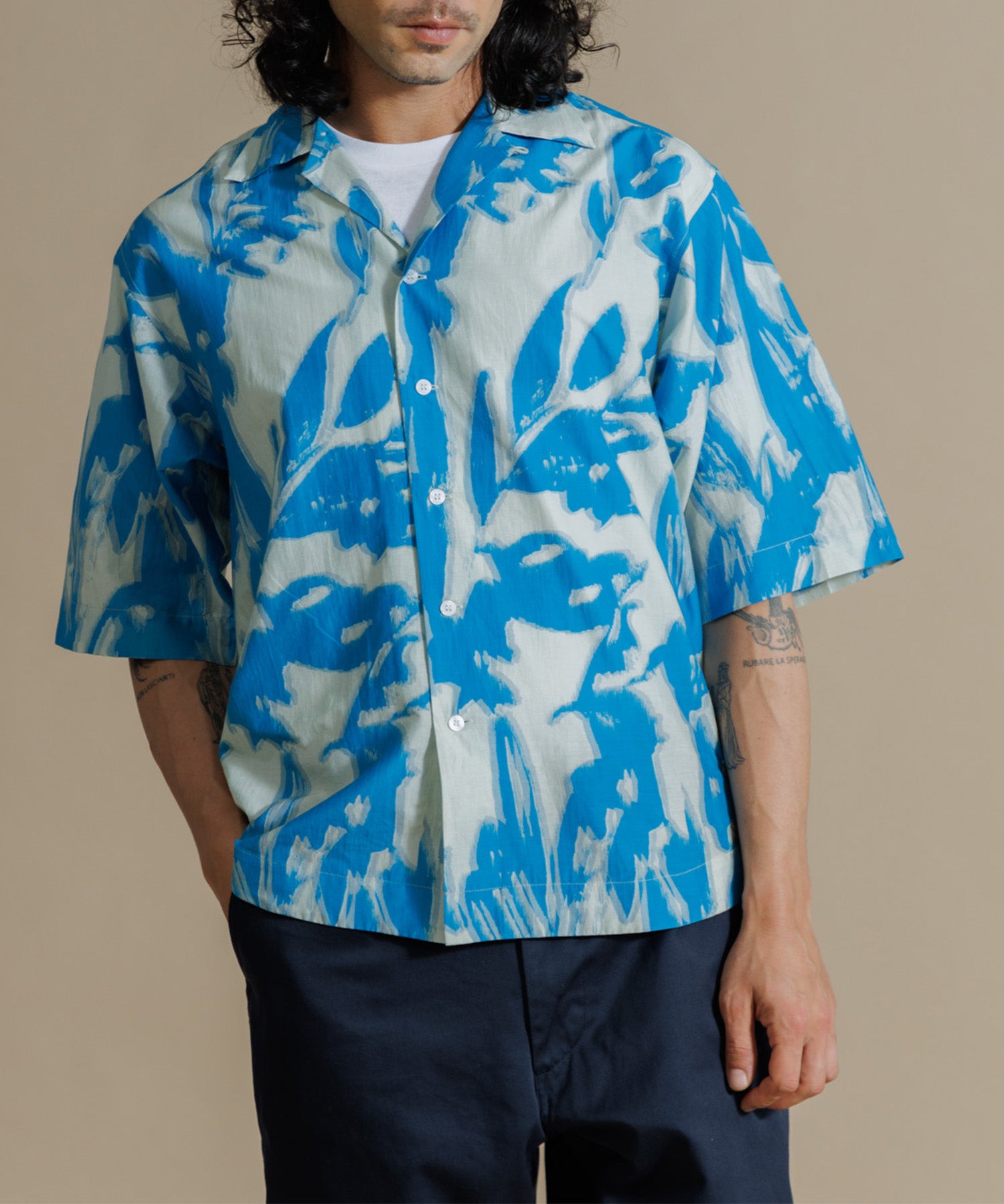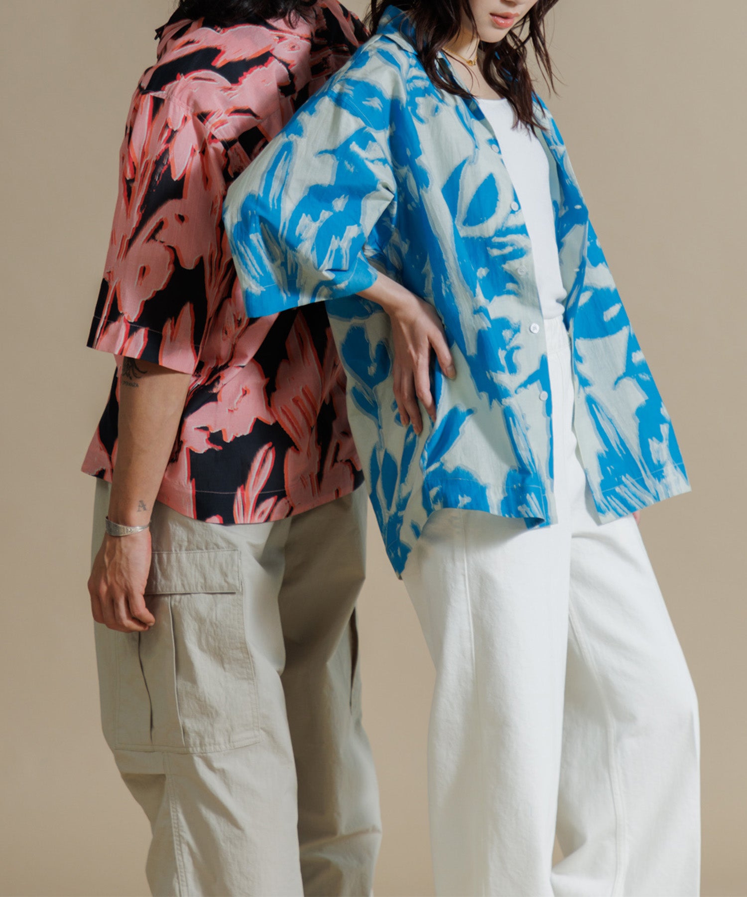 インドシルクの素朴な光沢感と鮮やかなカラーが特徴のオープンカラーシャツ。シルクの強さとコットンの優しさを合わせ持った伝統のハイブリッド素材を使用しています。綿との混紡で柔らかさもあり上品なツヤ感のある素材に、カラフルなリーフ柄プリントを入れ仕上げました。ドロップショルダーになっており、身幅や袖もゆったりと作られたオーバーシルエットがリラクシーなムードの一枚です。ユニセックスで着用いただけます。