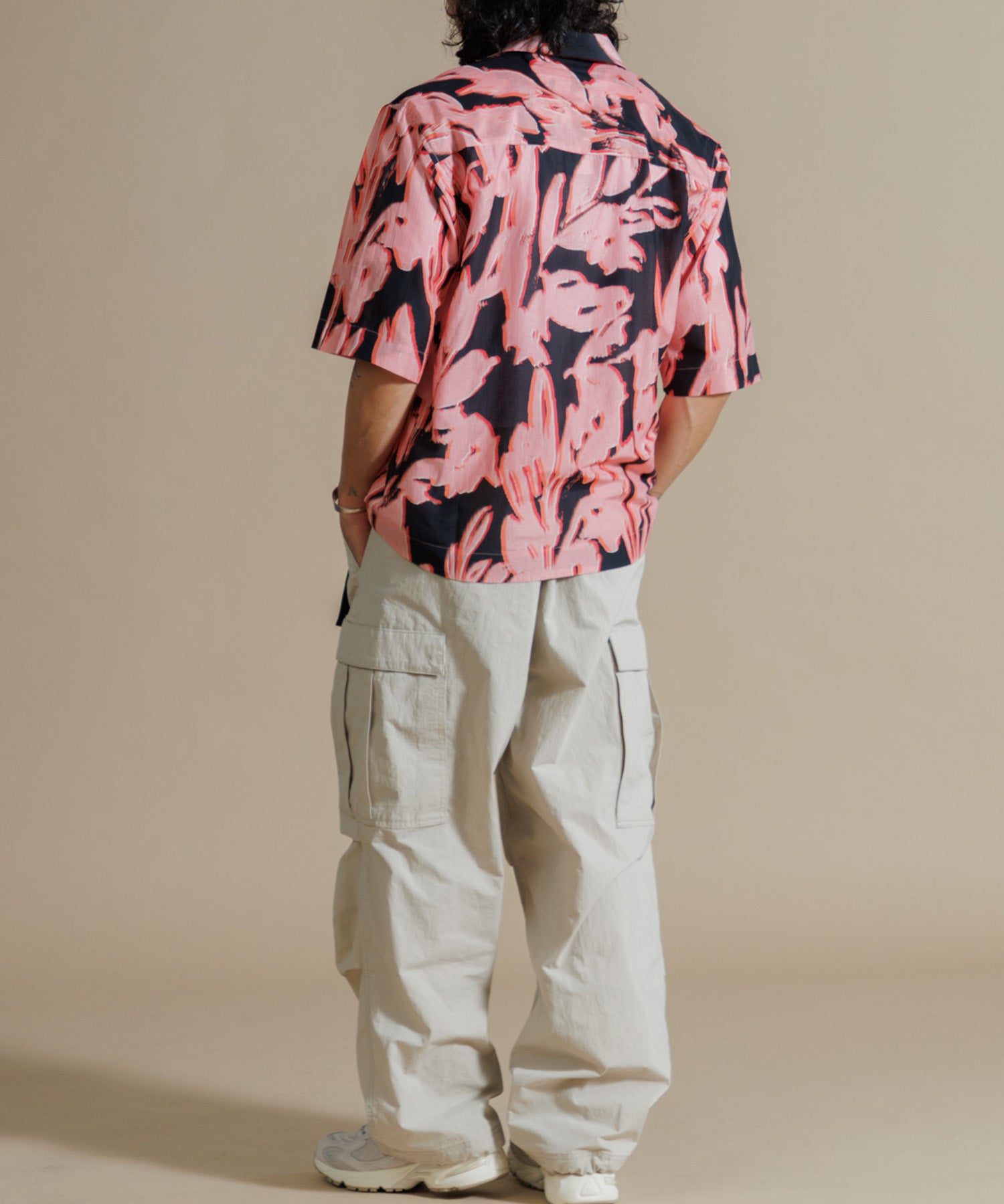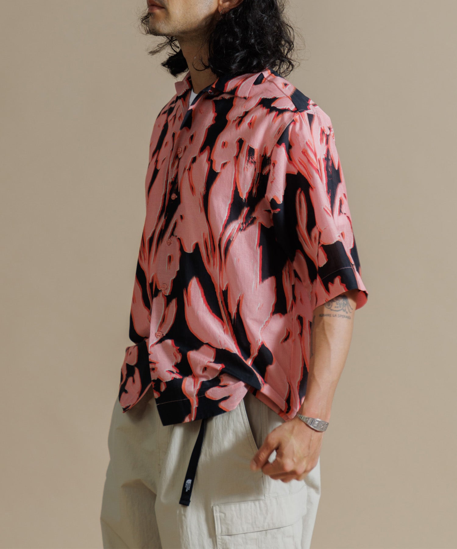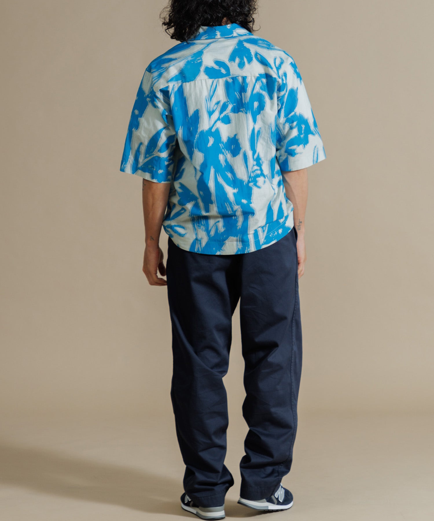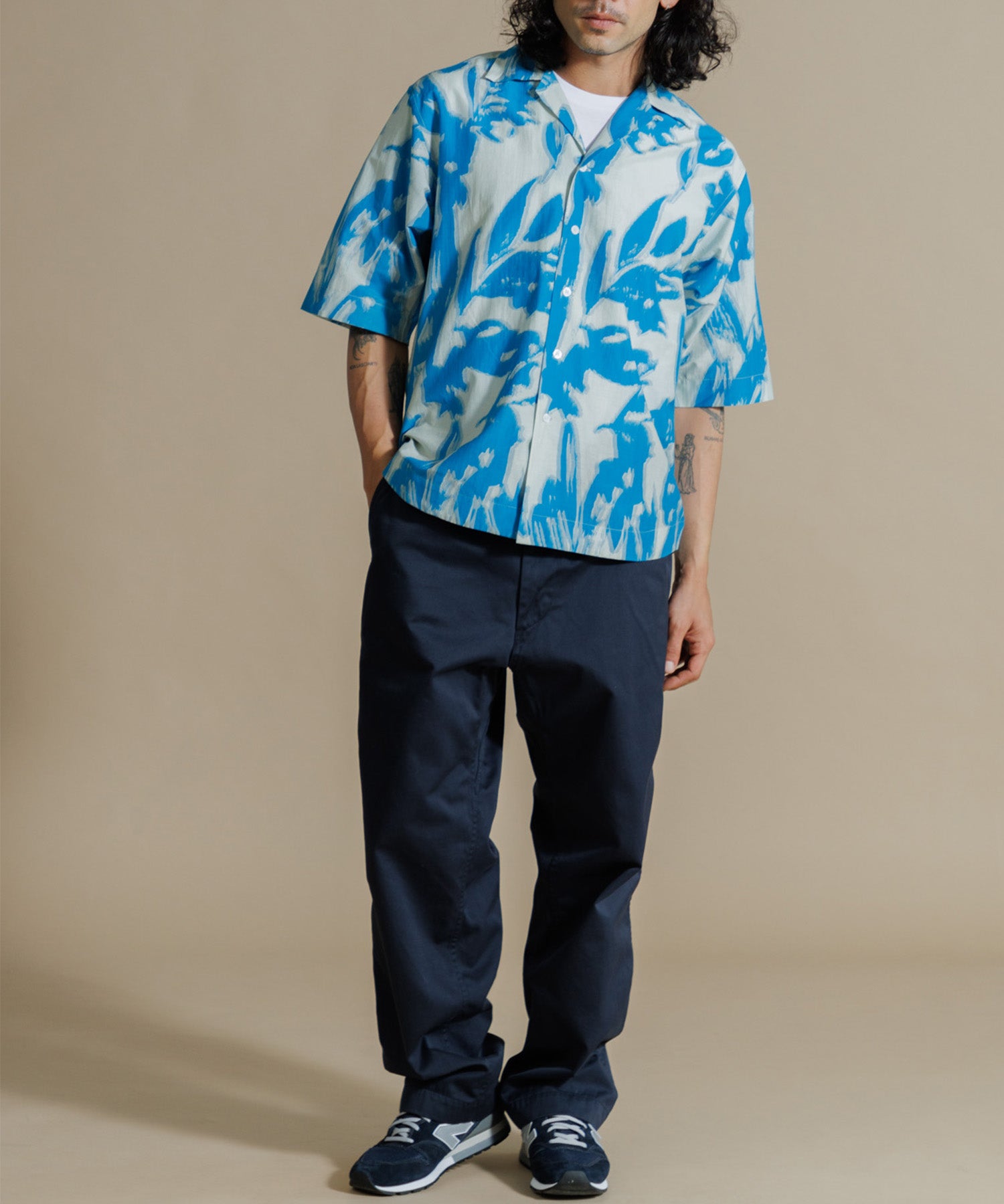 インドシルクの素朴な光沢感と鮮やかなカラーが特徴のオープンカラーシャツ。シルクの強さとコットンの優しさを合わせ持った伝統のハイブリッド素材を使用しています。綿との混紡で柔らかさもあり上品なツヤ感のある素材に、カラフルなリーフ柄プリントを入れ仕上げました。ドロップショルダーになっており、身幅や袖もゆったりと作られたオーバーシルエットがリラクシーなムードの一枚です。ユニセックスで着用いただけます。