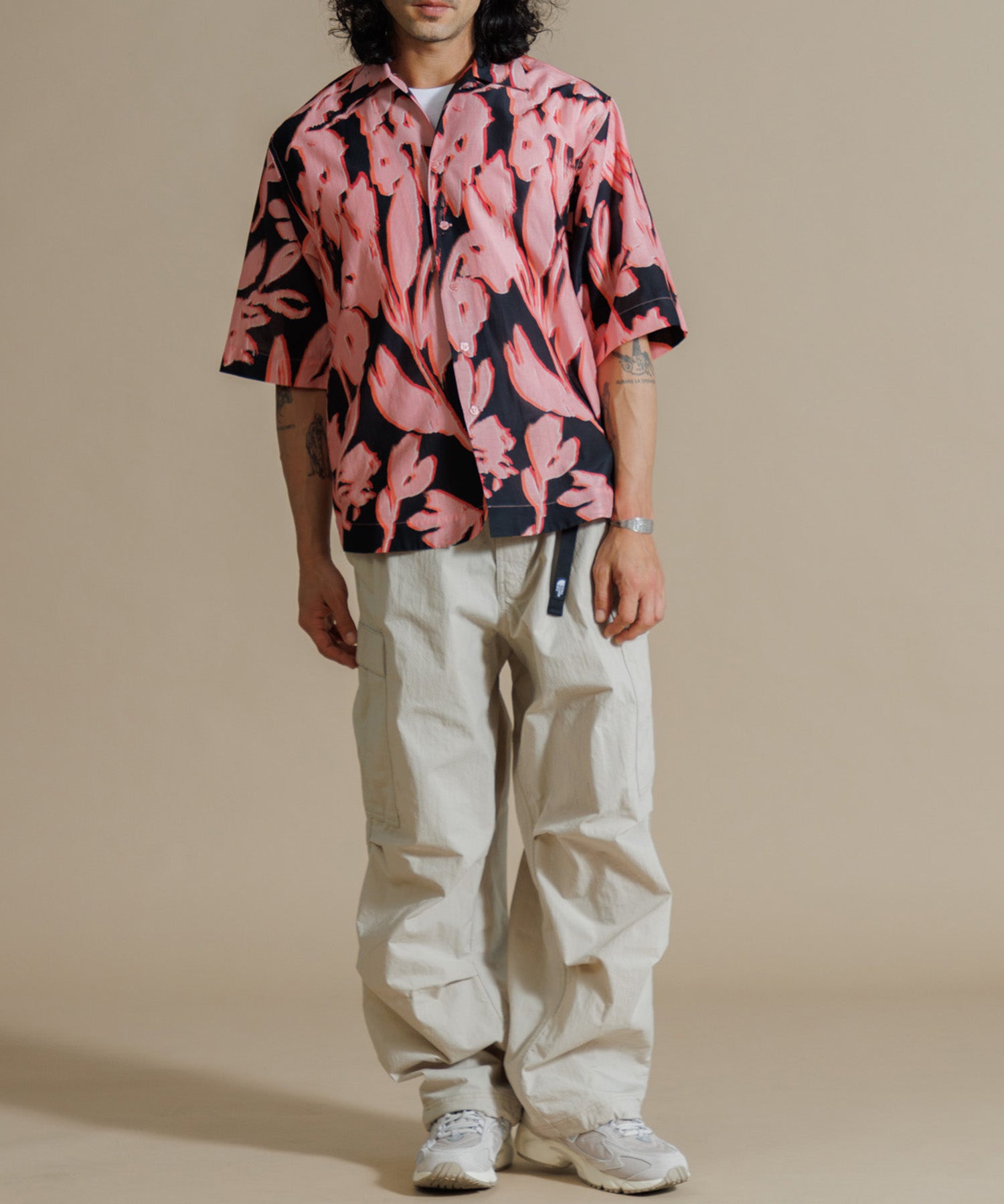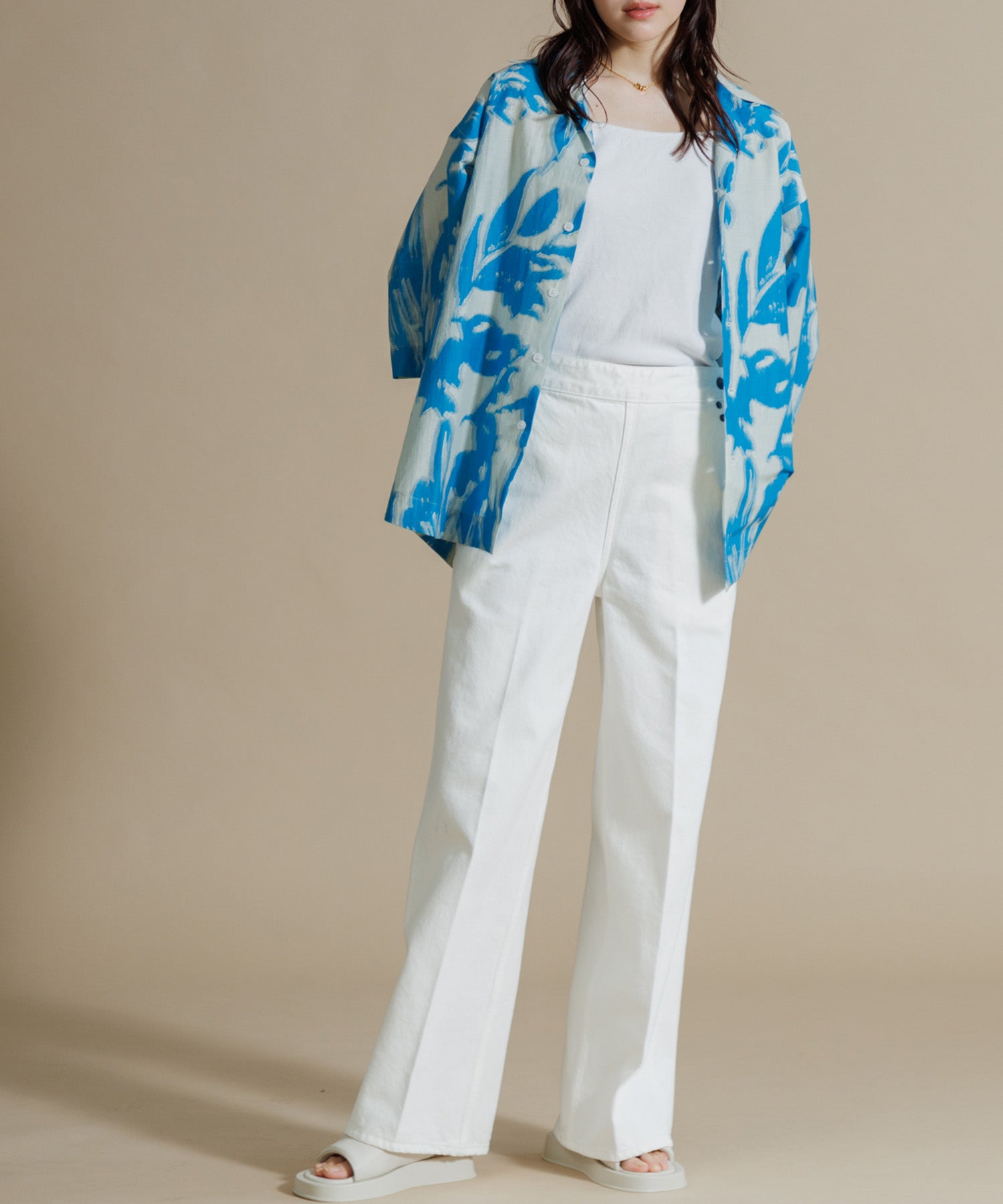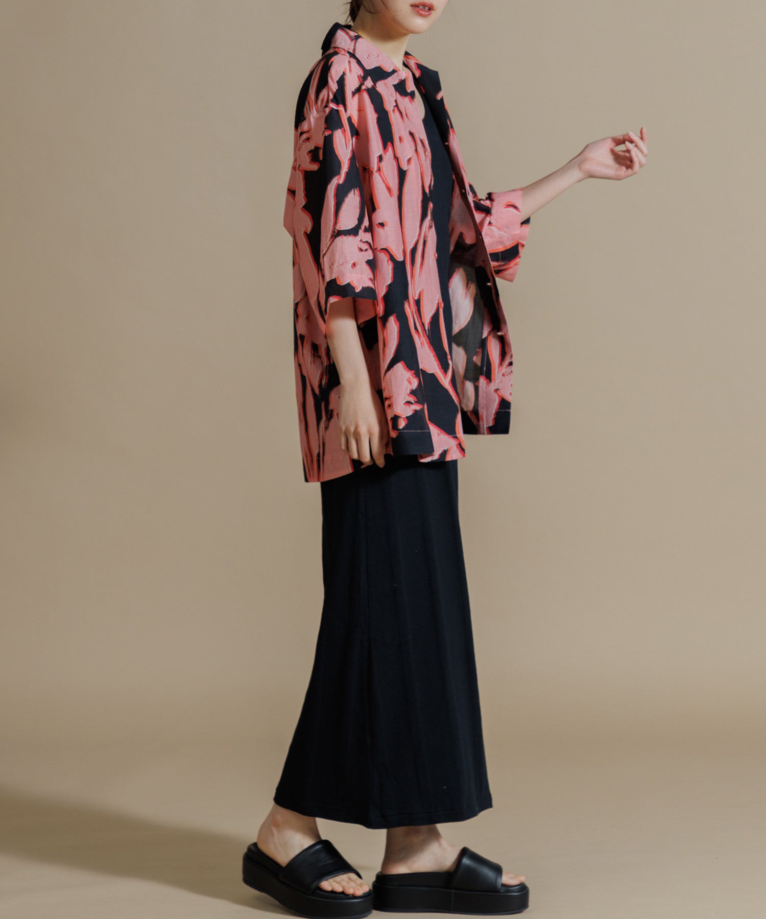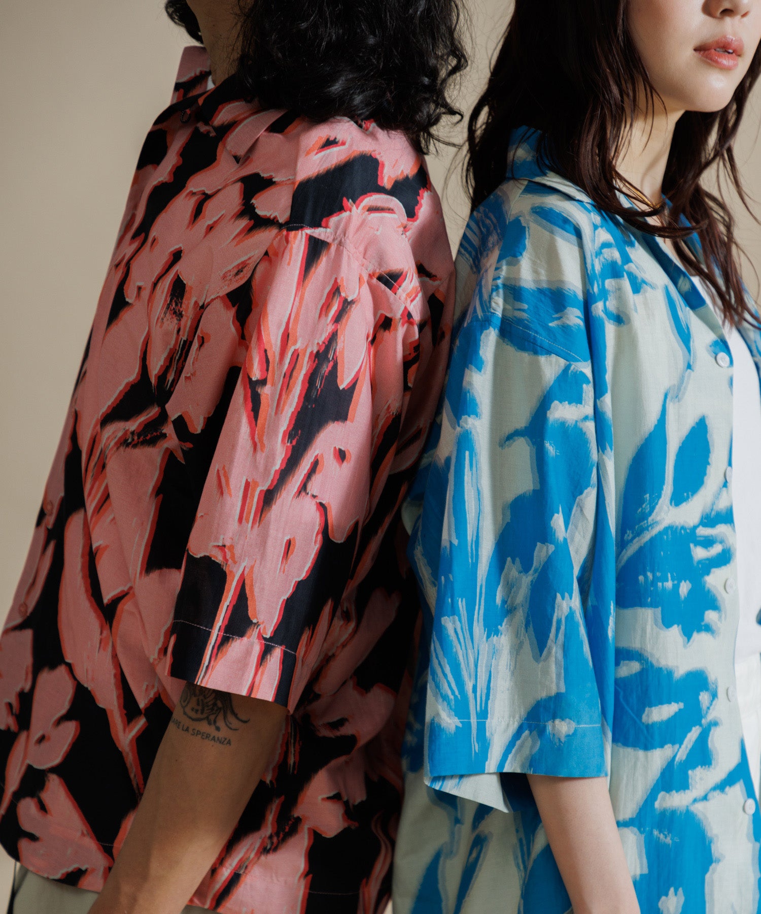 インドシルクの素朴な光沢感と鮮やかなカラーが特徴のオープンカラーシャツ。シルクの強さとコットンの優しさを合わせ持った伝統のハイブリッド素材を使用しています。綿との混紡で柔らかさもあり上品なツヤ感のある素材に、カラフルなリーフ柄プリントを入れ仕上げました。ドロップショルダーになっており、身幅や袖もゆったりと作られたオーバーシルエットがリラクシーなムードの一枚です。ユニセックスで着用いただけます。