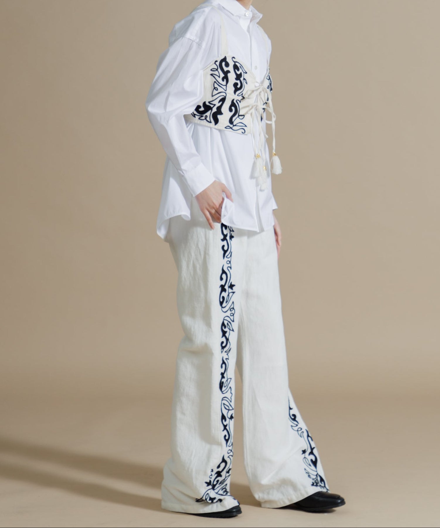 両脇にライン状にあしらった、インドの伝統的な刺繍「アリ刺繍」が目を惹くトラウザーズ。インドで一枚一枚、職人の匠の技で作られたアイテムです。シンプルなトップスに合わせるだけでこなれた印象に。同素材のビスチェと合わせて存在感抜群に着こなすのもおすすめです。