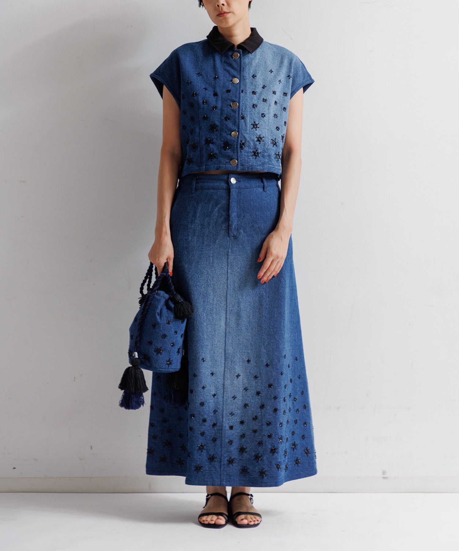 コンパクトな着丈と程よくゆとりのあるシルエットで、すっきりとしたバランスに仕上げた一着。インドの職人が手作業であしらったビーズがさりげないアクセントに。柔らかい質感のカディ素材でできており、袖はやや肩にかかるフレンチスリーブ風のデザインで、二の腕を自然にカバーしつつ、抜け感のある印象に。同素材のスカートとセットアップでの着用はもちろん、ワンピースやカットソーに重ねるだけでスタイリングをアップデート。シンプルながらも存在感のある一枚です。カディは、インド伝統的な「手紡ぎ」「手織り」で作られており、手で紡がれた綿糸から作られるカディは、糸の太さが不均一であることが特徴です。これらがすべて手作業で仕上げられているため、素朴な風合いとふんわりと空気を含んだ柔らかさが生まれています。
