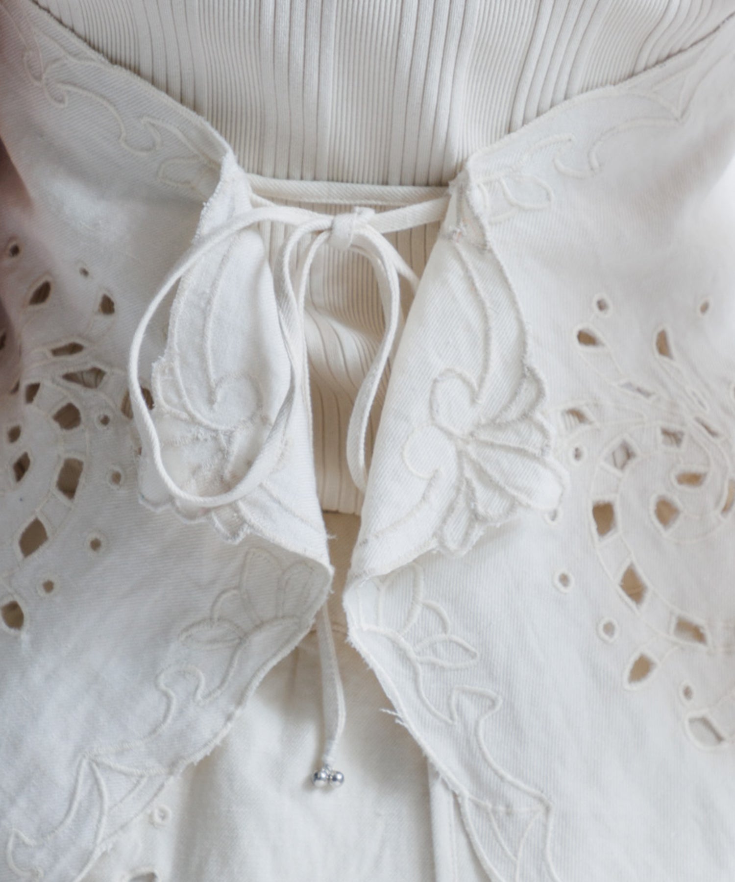 ナチュラルな風合いの綿麻素材を使った、デザイン性の高いカットワーク刺繍アイテム。