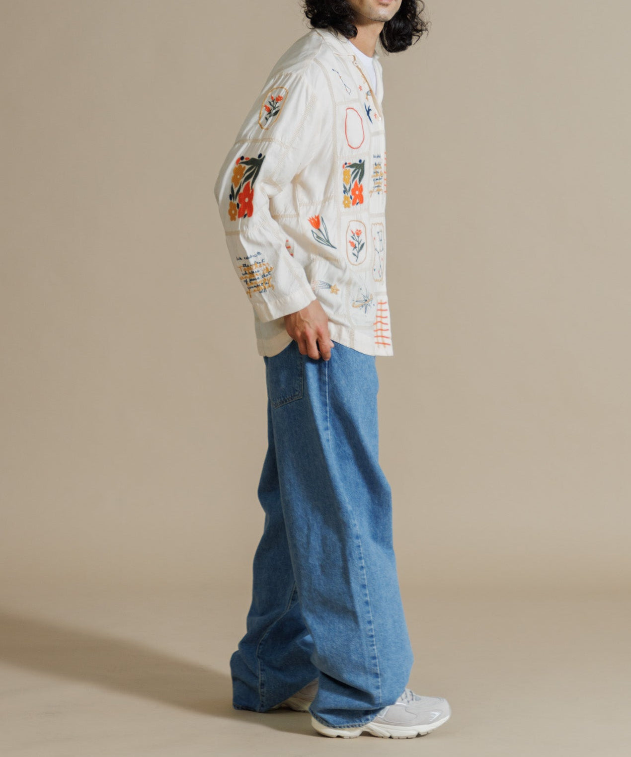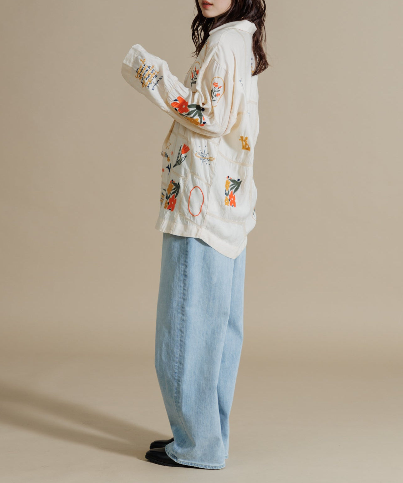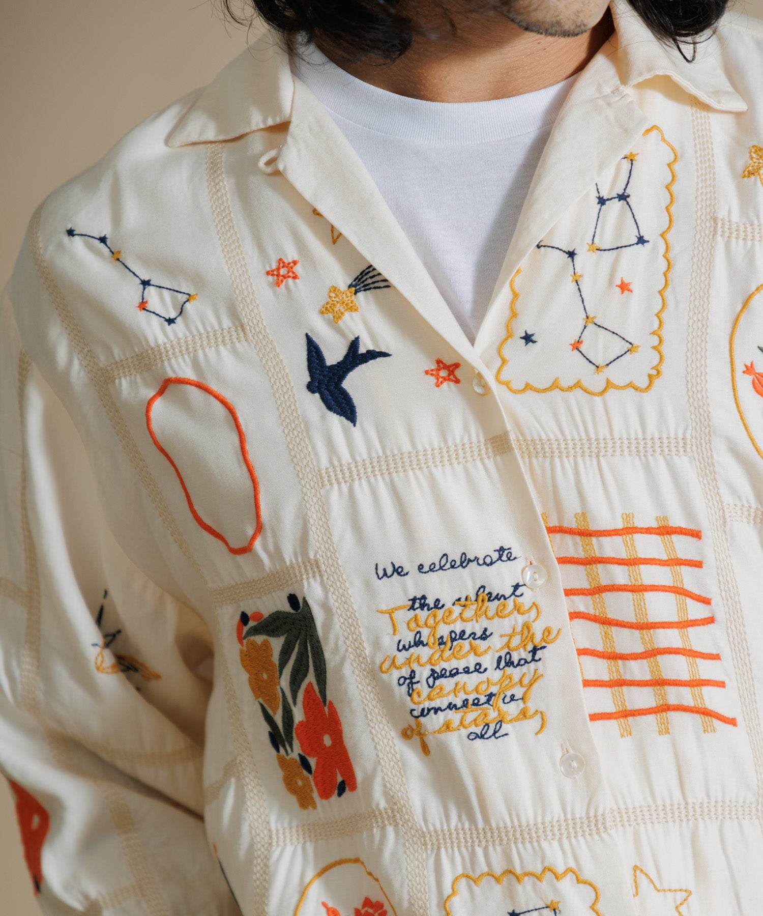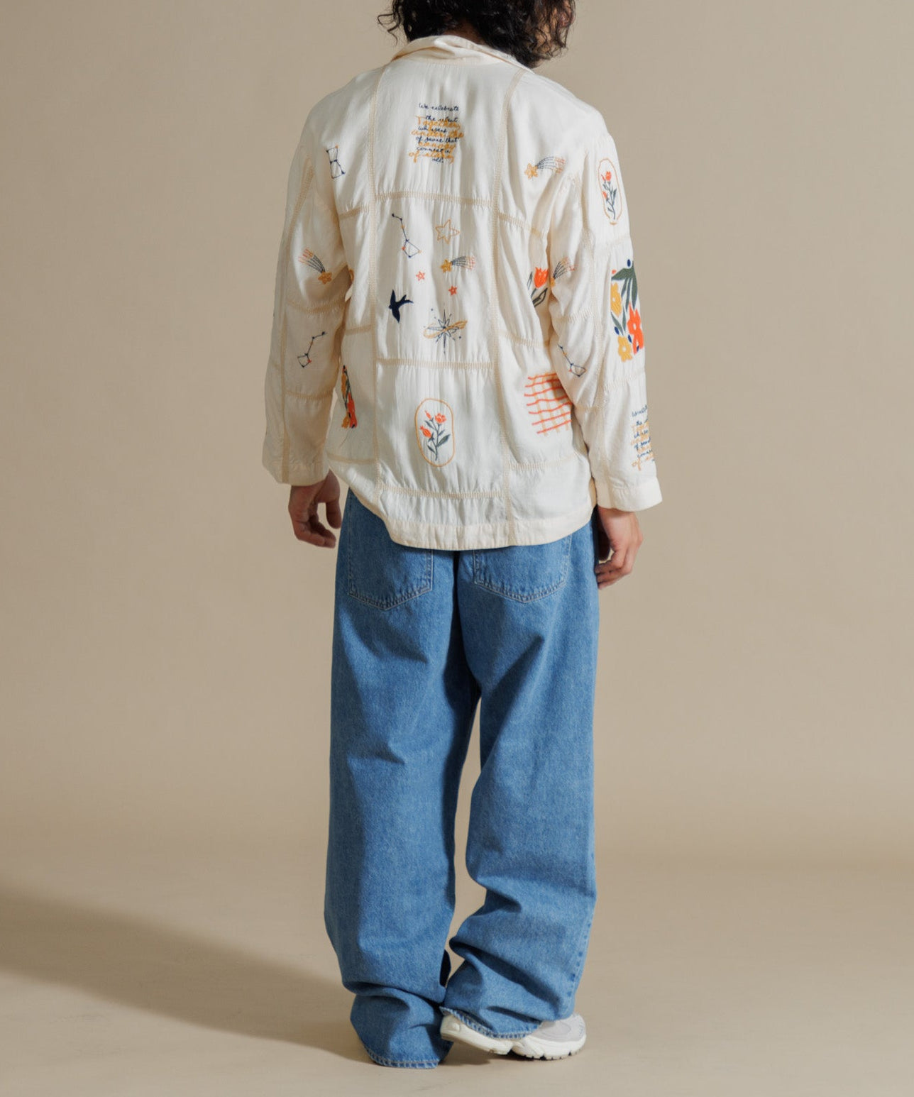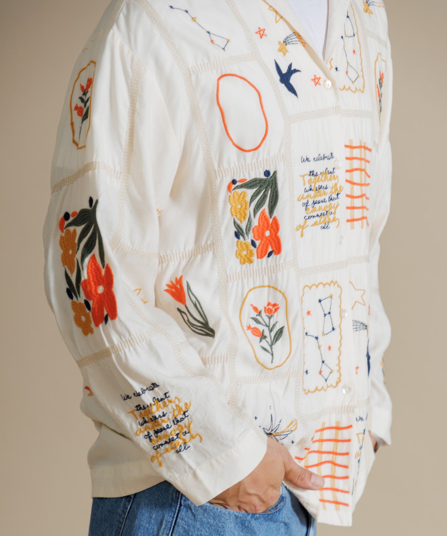 とろみのあるテンセル100%のシャツに、パッチワーク風14柄の刺繍をふんだんにあしらったシャツ。ほどよい肉感に落ち感のある素材で、マシーン刺繍の手法を何種類も入れ雰囲気のある見え方に。1枚で映え、シンプルなボトムスに合わせるだけでこなれた印象に仕上げてくれる一枚です。ユニセックスで着用いただけます。