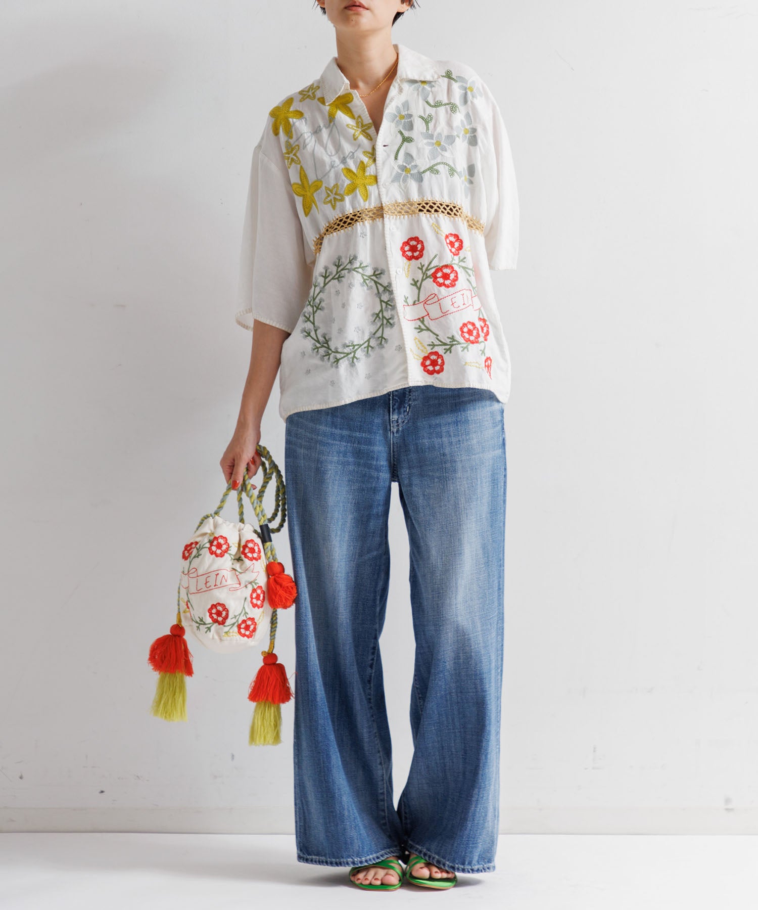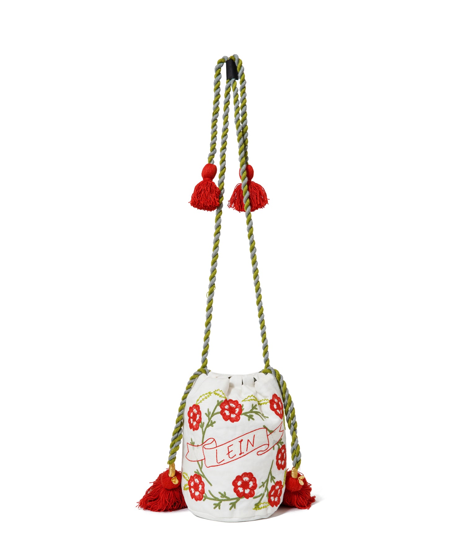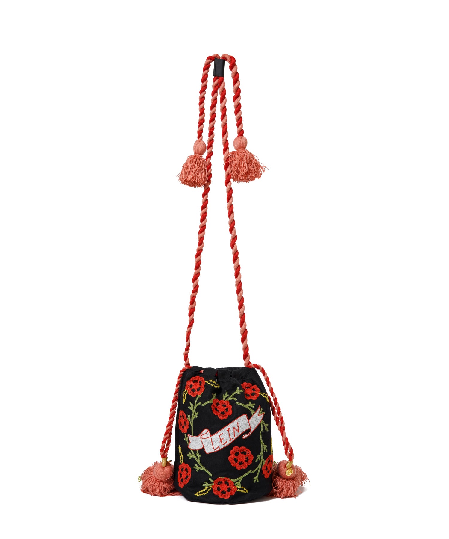 鮮やかなフラワー刺繍と大胆なタッセルが目を引く、コットンリネン素材のショルダーバッグ。